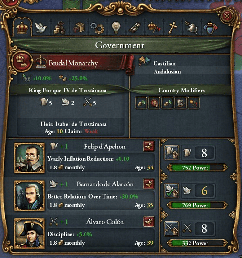 NFはDIPのペナルティーを打ち消すためにDIPに設定してるけれど、エンリケ4世のADM5DIP2MIL5っていう能力値もあって、ADMとMILは最新技術についていった上で余裕が出てきたけど、DIPは全然足らないのよね。