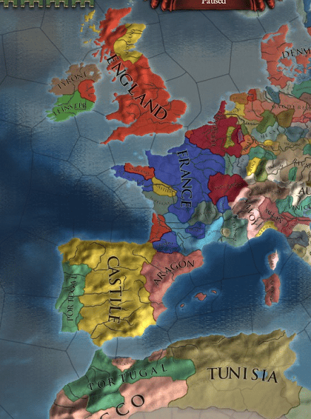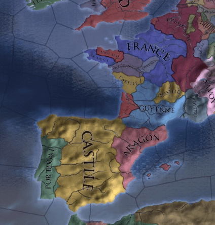 私たちはスペイン成立くらいまではDIPにペナルティーを受け続けるわけだし、ギュイエンヌとかナポリとかが外交併合の順番待ちしてる状況よ。