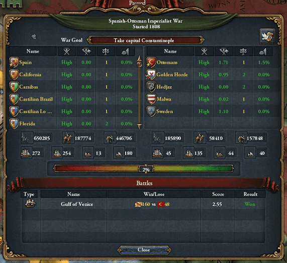 スペインは陸では広大なオスマン帝国の領土の過半数を占領し、海では敵艦隊を散々に打ち破った上で首都コンスタンティノープルを無敵艦隊をもって封鎖しました。
