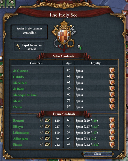 ただでさえ基礎税の高いカトリック州を多く抱えている上に、教皇庁との関係も良好、NIアイディアのブーストを受けた上に、積極的な海外進出後の改宗でどんどん信仰ptが溜まる、と。