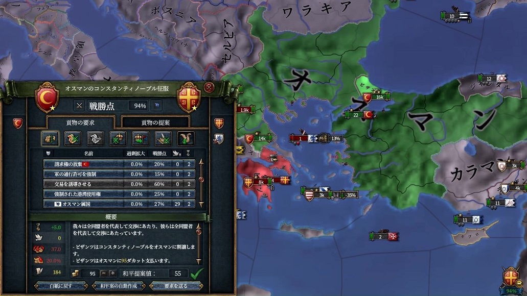 コンスタンティノープルの割譲はそれだけでAEが35飛んじゃうので、これを可能な限り圧縮しましょう。