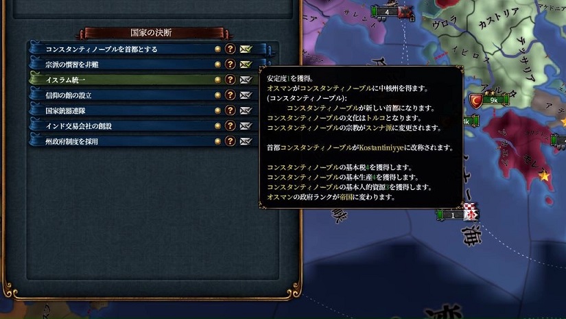 軍事フォーカスを維持した方が当然MILは上げやすいのですが、正教オスマンだとコンスタンティノープルを自力でコア化+遷都しなければならず、ここで統治点が400近く吹っ飛びます。