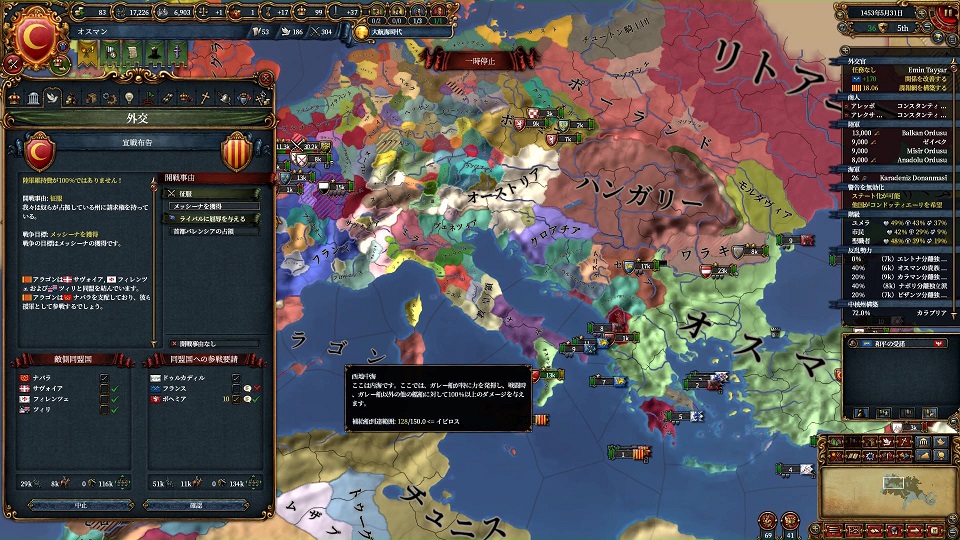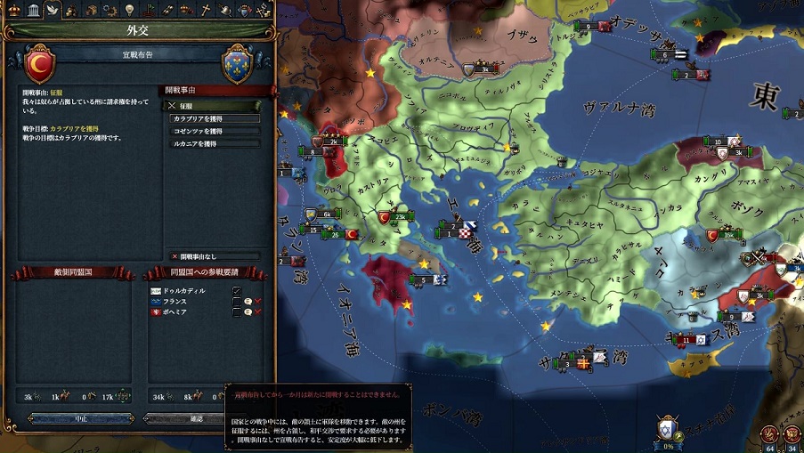 アナトリアでぶらぶらしている間にボヘミアの好感度が溜まっているはずなので、彼を連れてアラゴンに宣戦します。