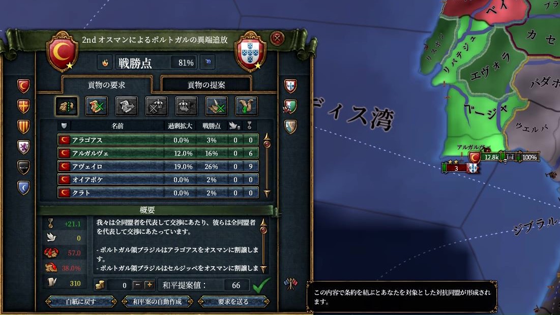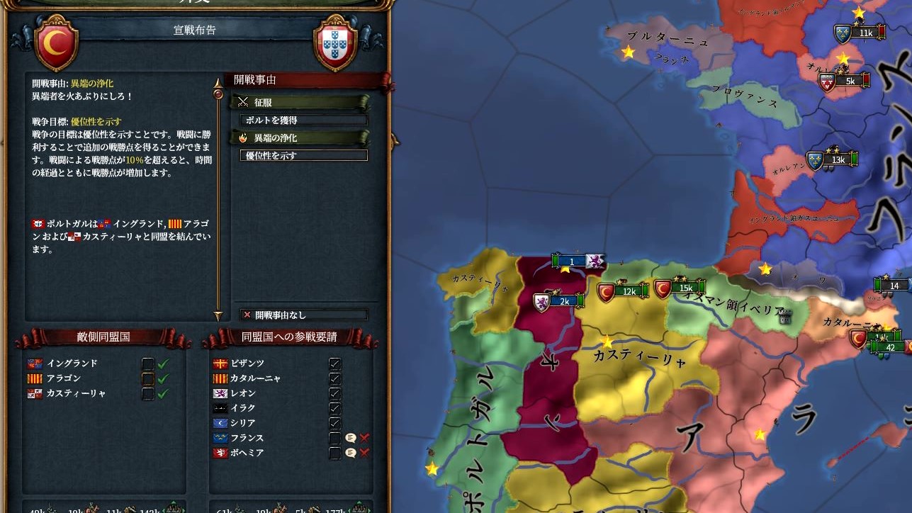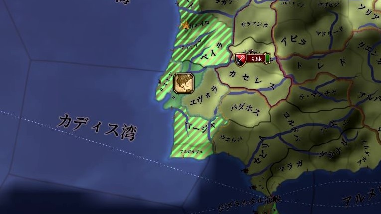 録画+スクショミスでカットしていますが、その前にカスティーリャを殴ってレオンの中核州+ポルトガルの国境を割譲させています。