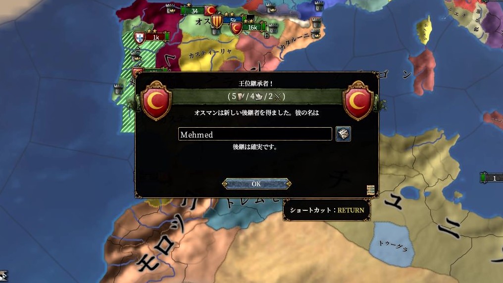 合計値14の君主から生まれた割にはパッとしない能力。まあでも仕方ないので後継者はこいつにします。
