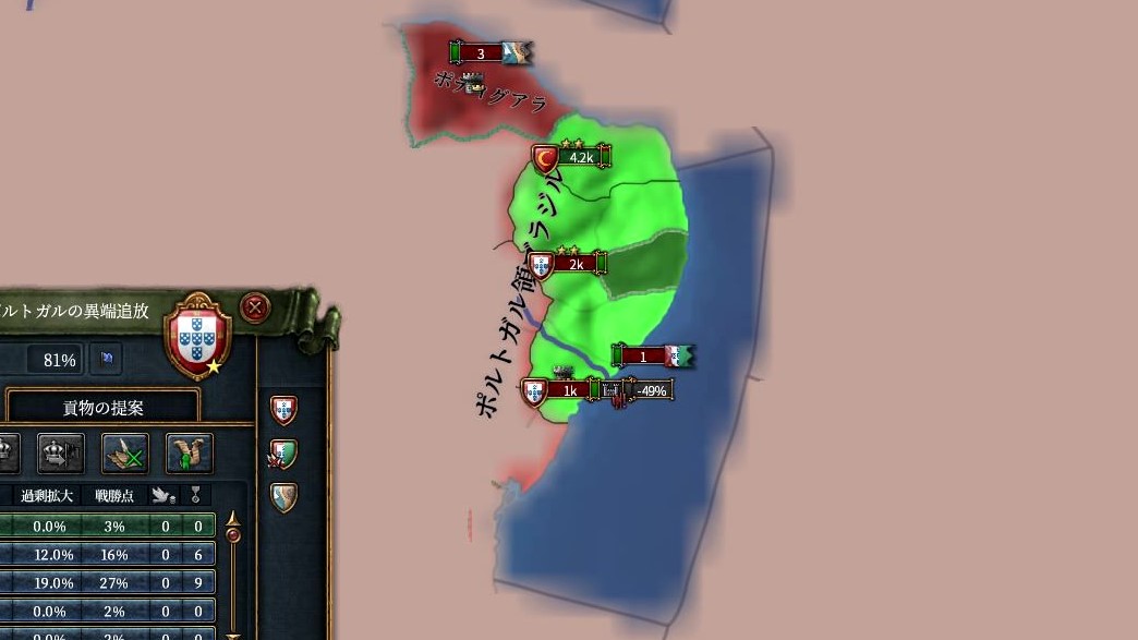 ……という感じで事を進めてる間にポルトガルとの停戦が終了。いよいよブラジルを切り取りに行きます。