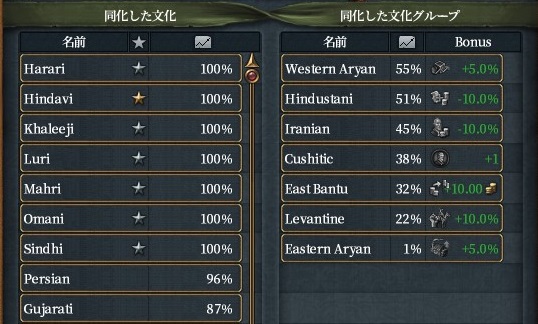 また、文化同化システムによりある文化を有するプロビを全て領土とすると自動的に受容され、同じ文化グループに属するプロビを全て領有すると文化グループ毎の補正効果を得られます。