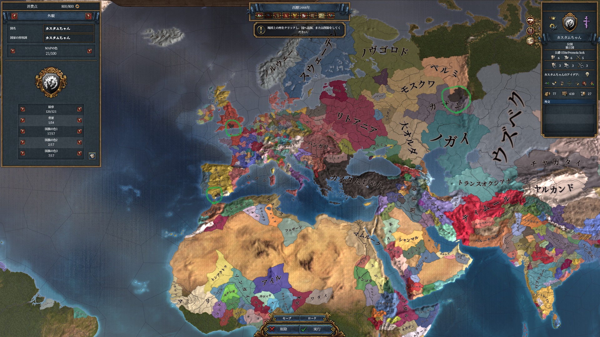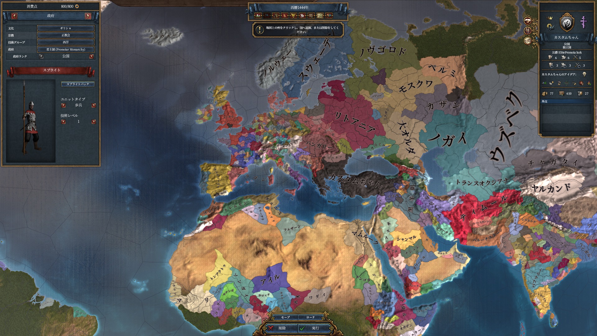 カスタム国家は満点使える設定とし、800点使ってビザンツ+αの領地に。