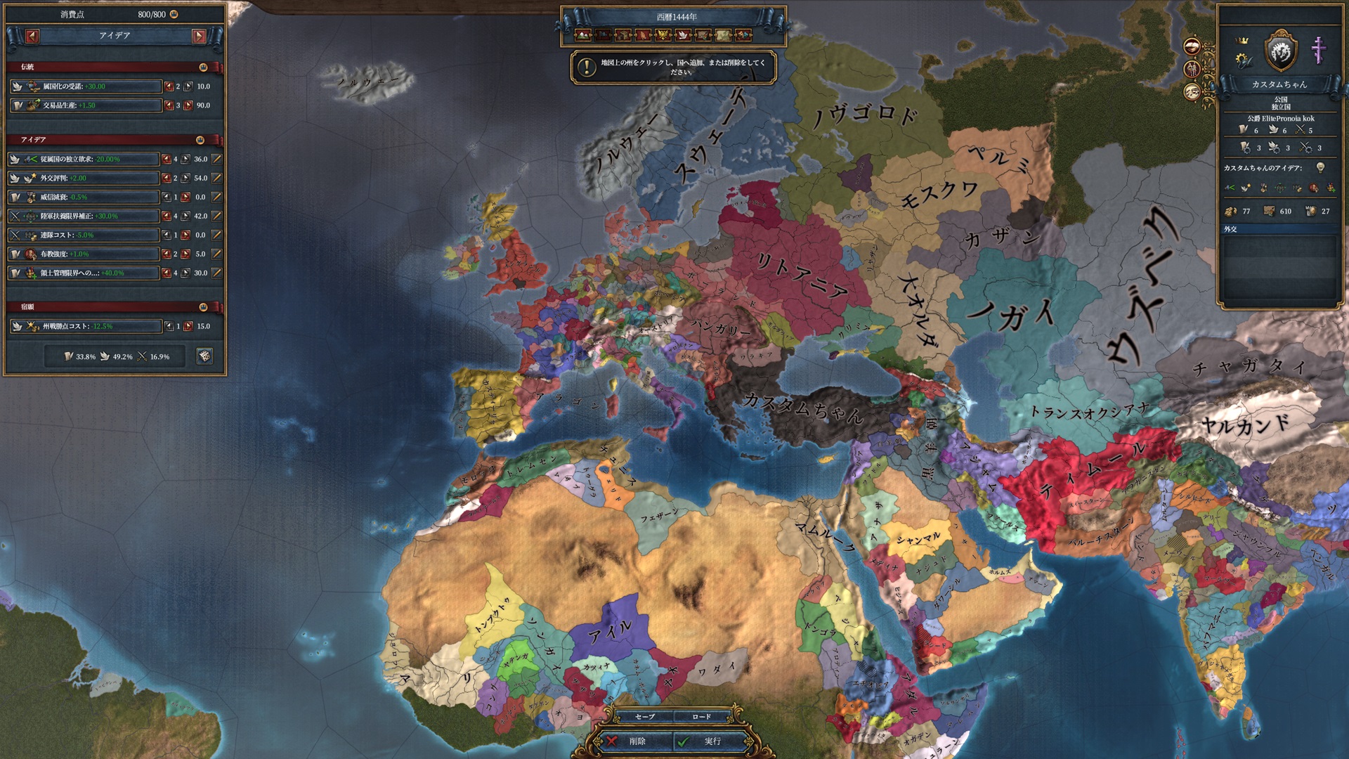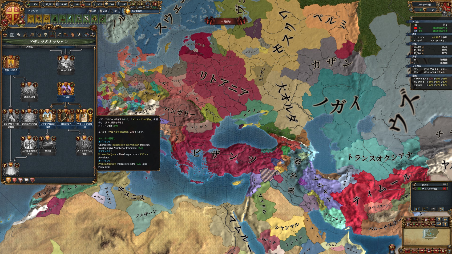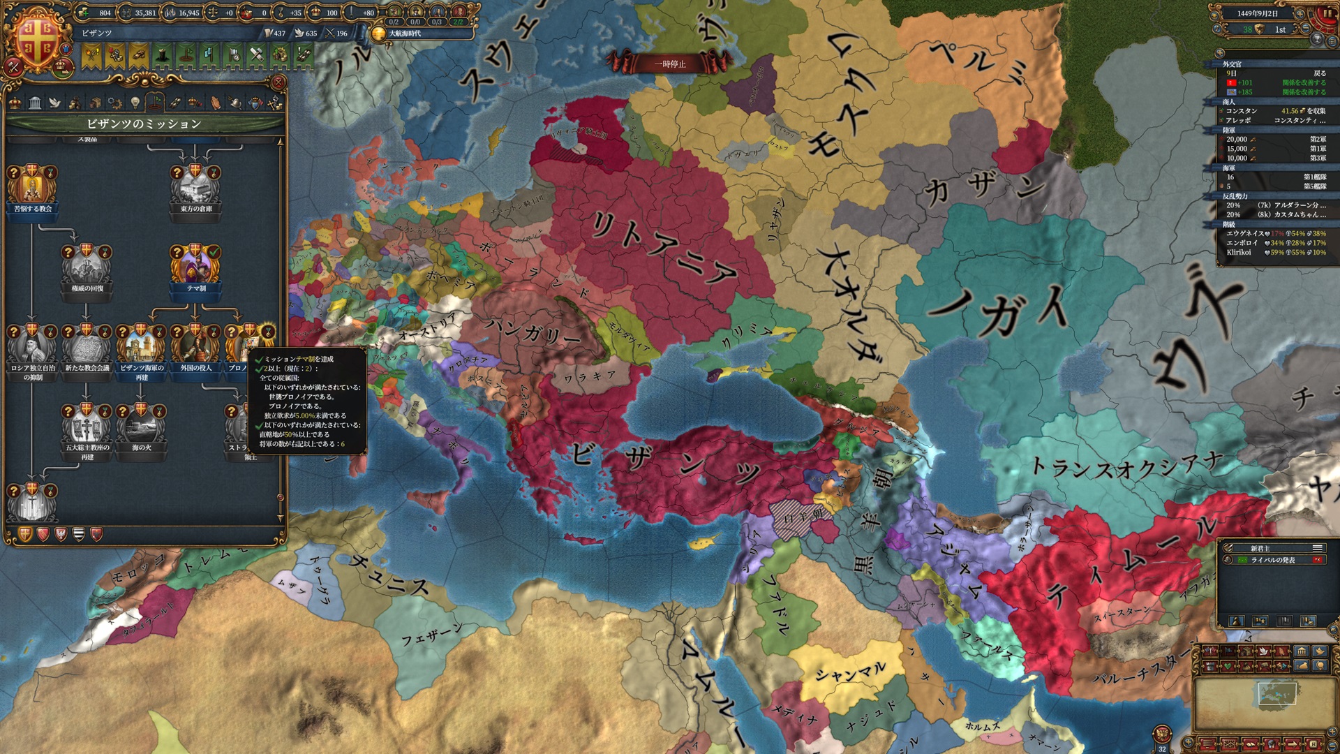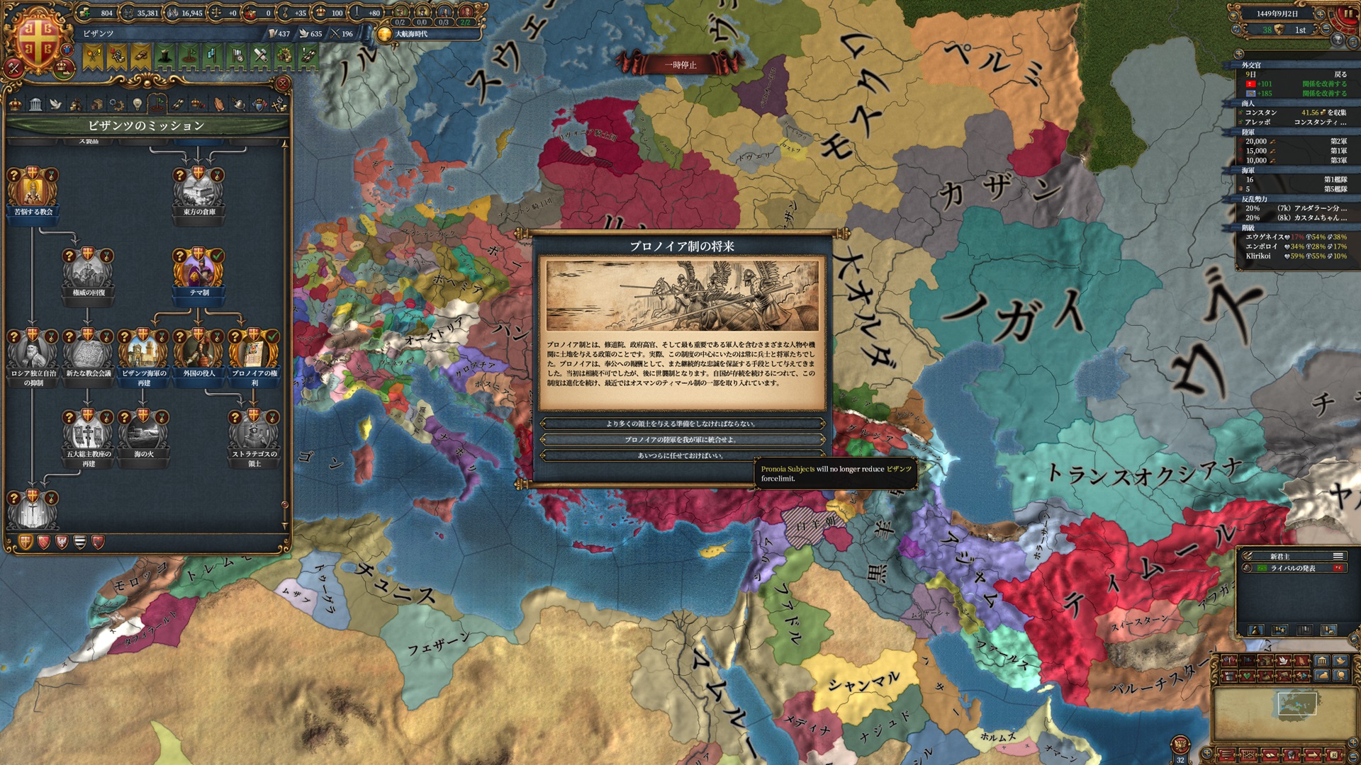 ティムールをはじめとした東方従属国は役目を皇帝に任せ現役を退き、中東やインドにプロノイアを作るほど東・南方面は拡張が成功しつつあります。
