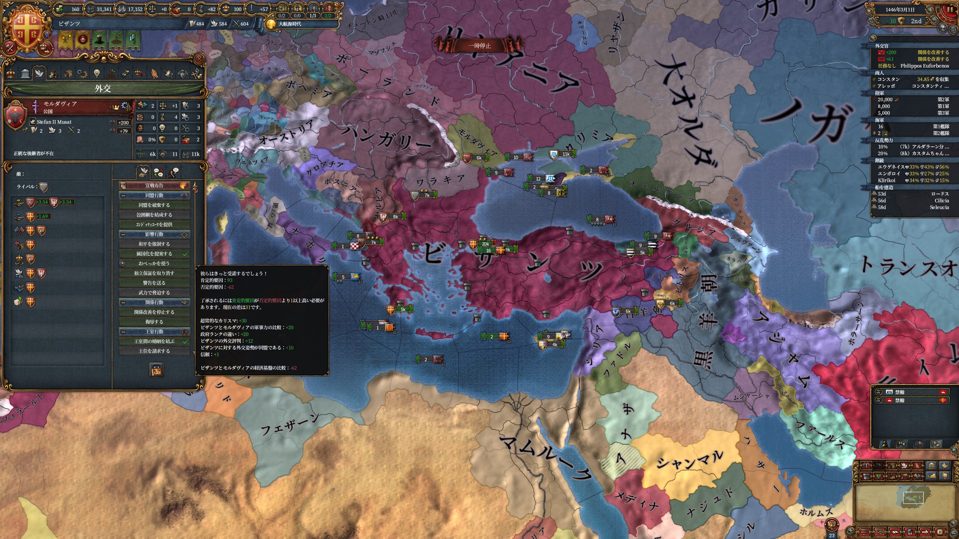 特にイベントで消えるモルダヴィア、イングランドの侵攻が早いアイルランド、イベリアの伸長を抑えられるグラナダは急ぎたいところ。