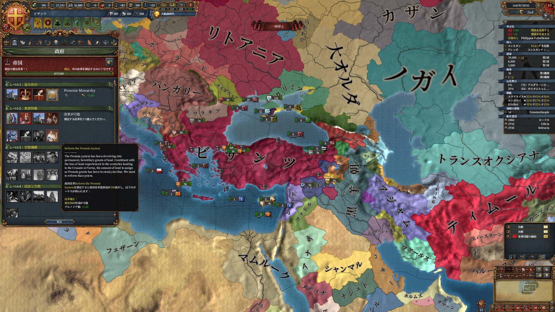 今回はカスタム国家でのプレイになりましたが、ビザンツは勿論としてローマ帝国政体でもプロノイアが使用可能です。