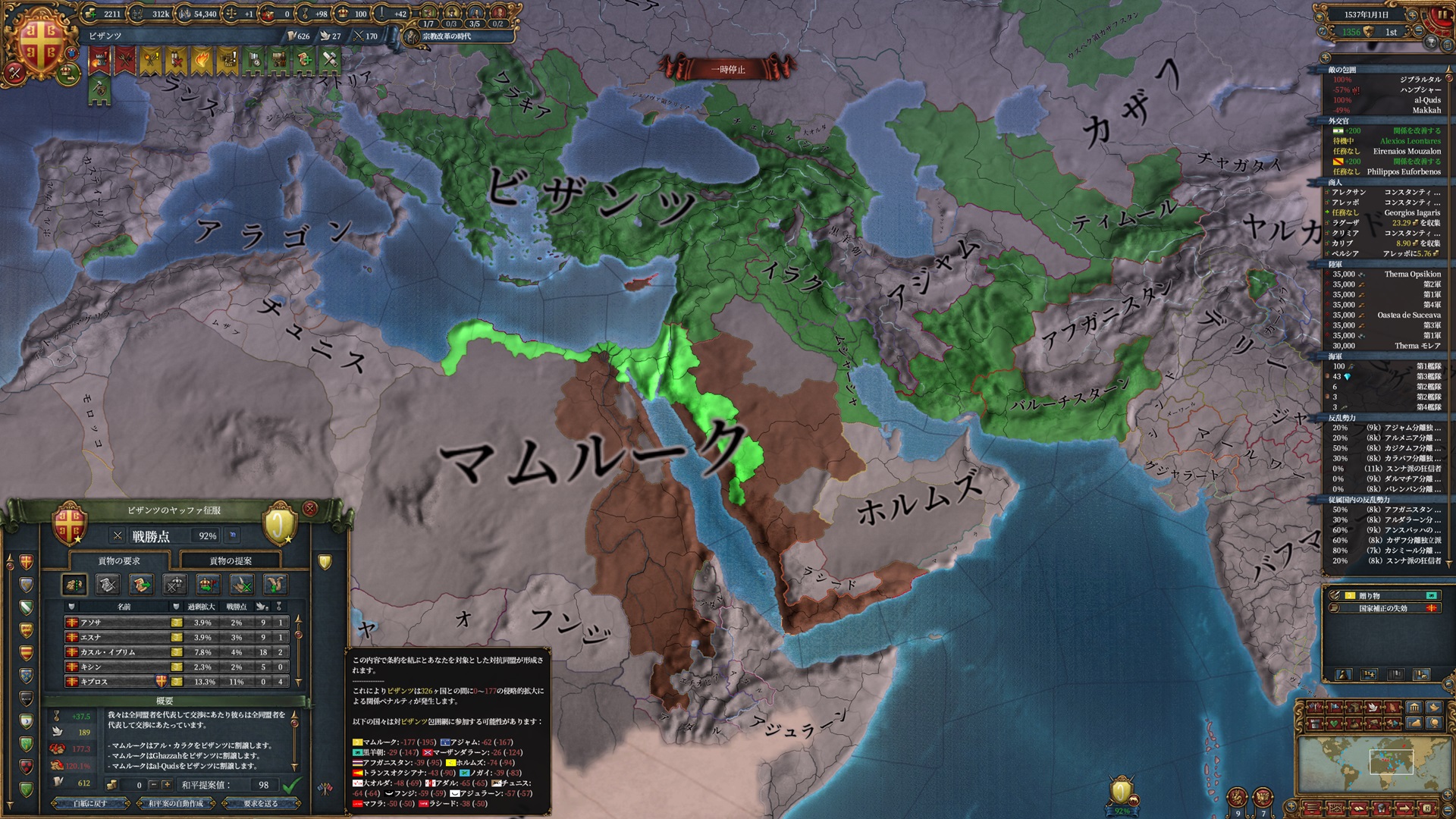外交属国化でも良かったのですがマムルーク領に作った衛星国が反乱軍にやられまくっていたので通るついでに対処させています。