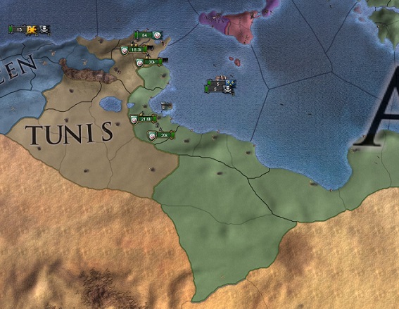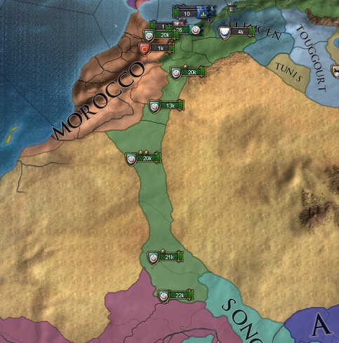 珍しく(?)北アフリカ3カ国(Morocco、Tlemcen、Tunis)が存命していたので、順番に宣戦。