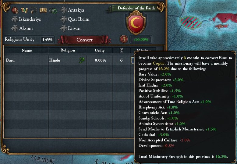 これは、インドネシアの国家を複数残しておいてしまっていたことによりその国家間の征服→改宗で Religious Zeal が発生し、改宗を行えていなかったものです。