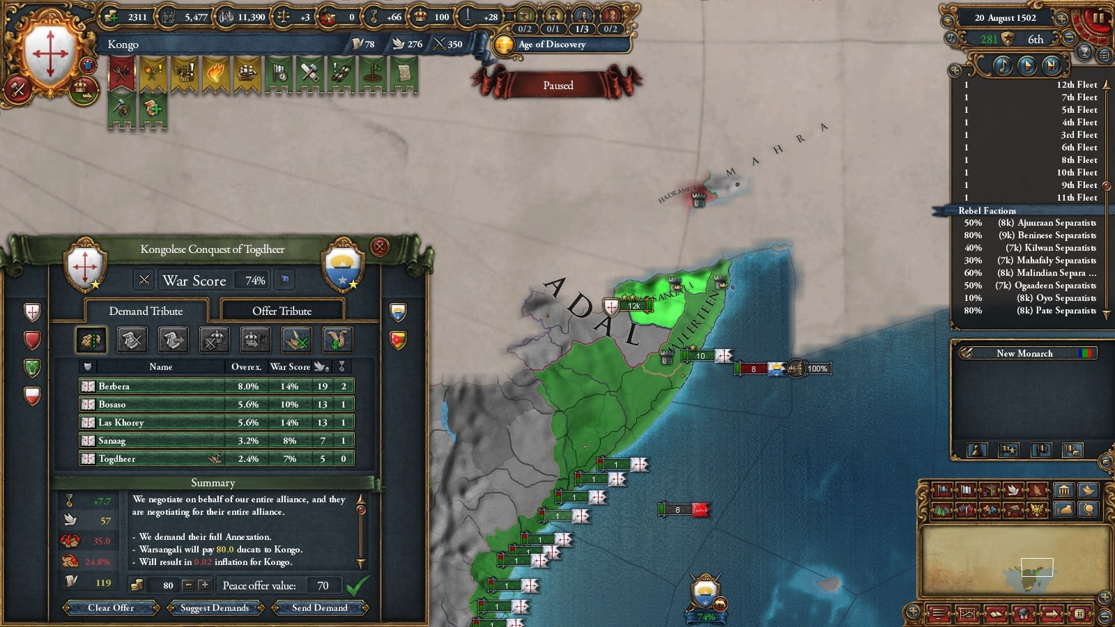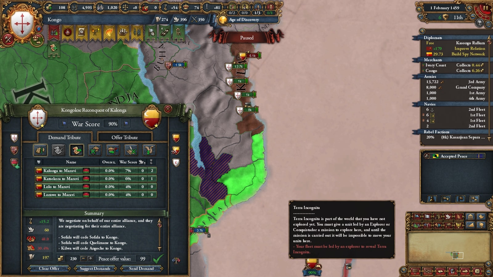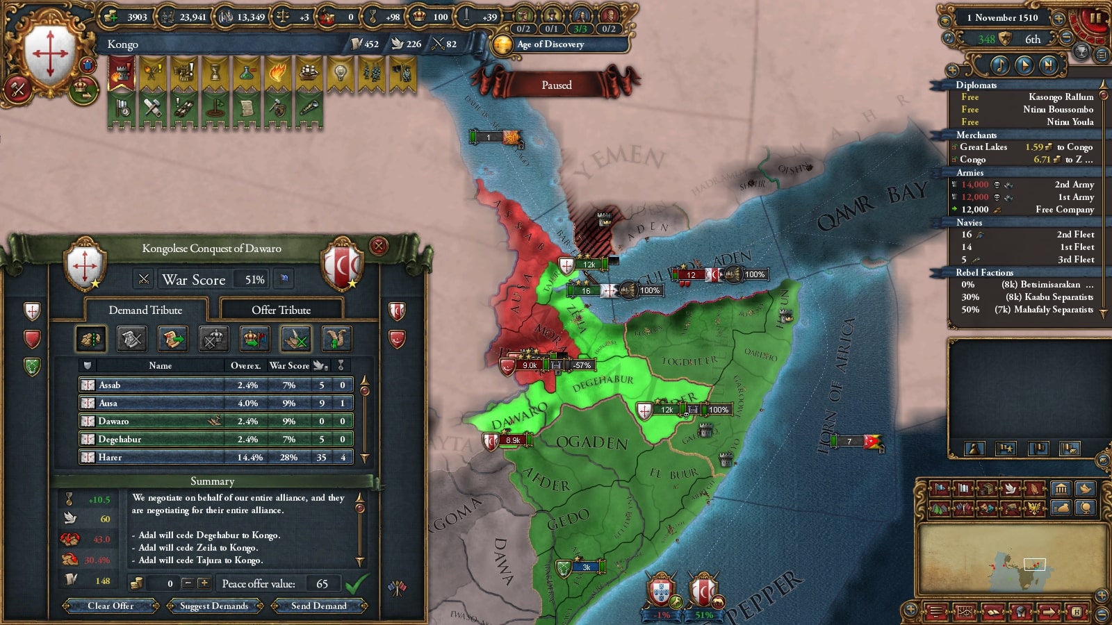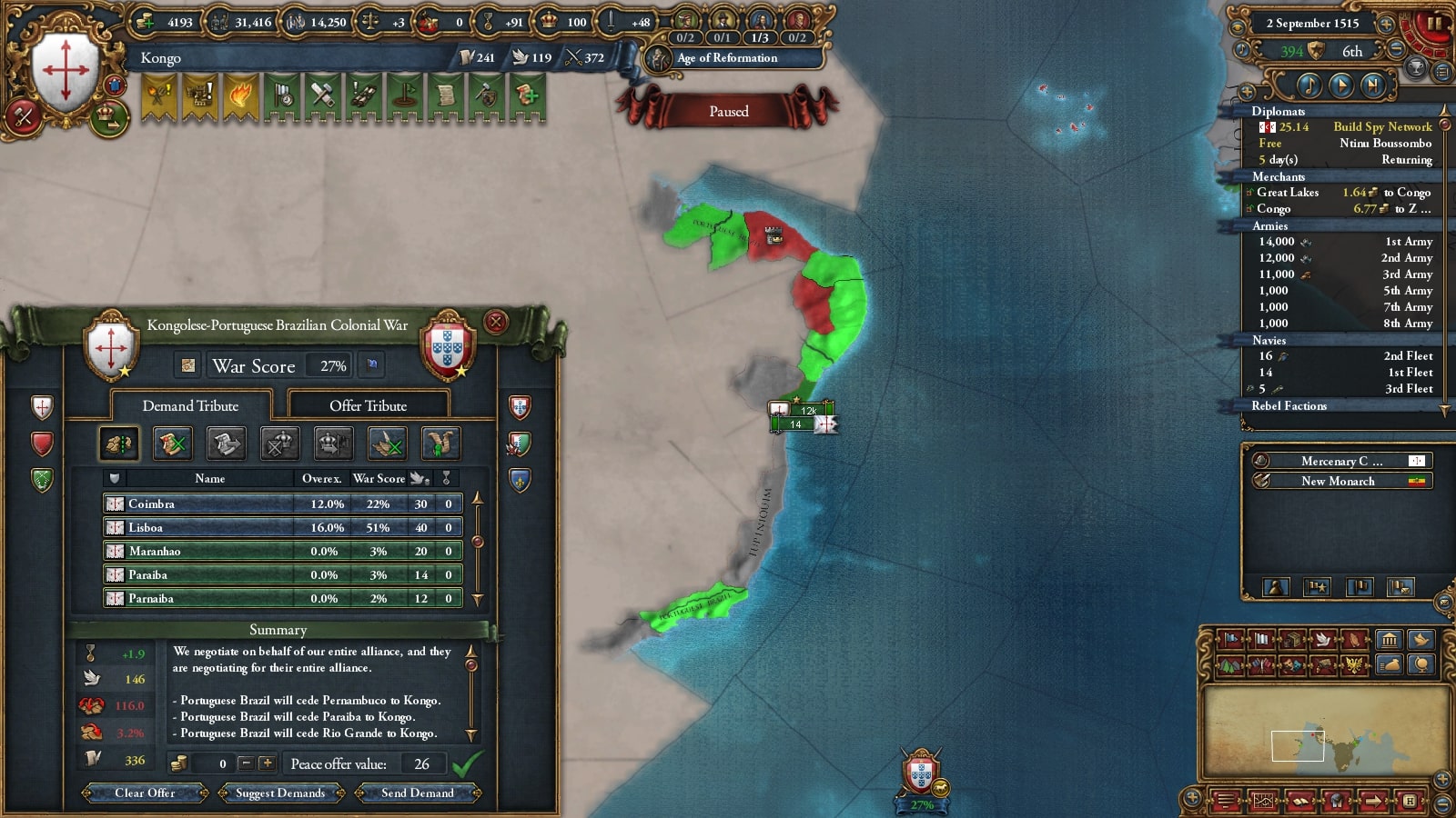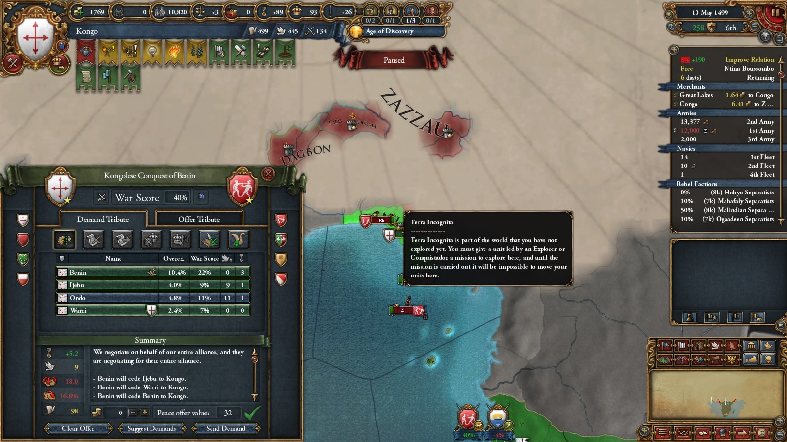 イフェ獲得による宣教師確保、ブラジルまでの植民距離短縮を狙ってベニンに宣戦していました。見づらいですが(申し訳ない)沿岸部をすべて割譲しています。