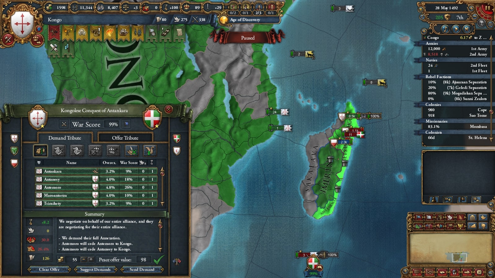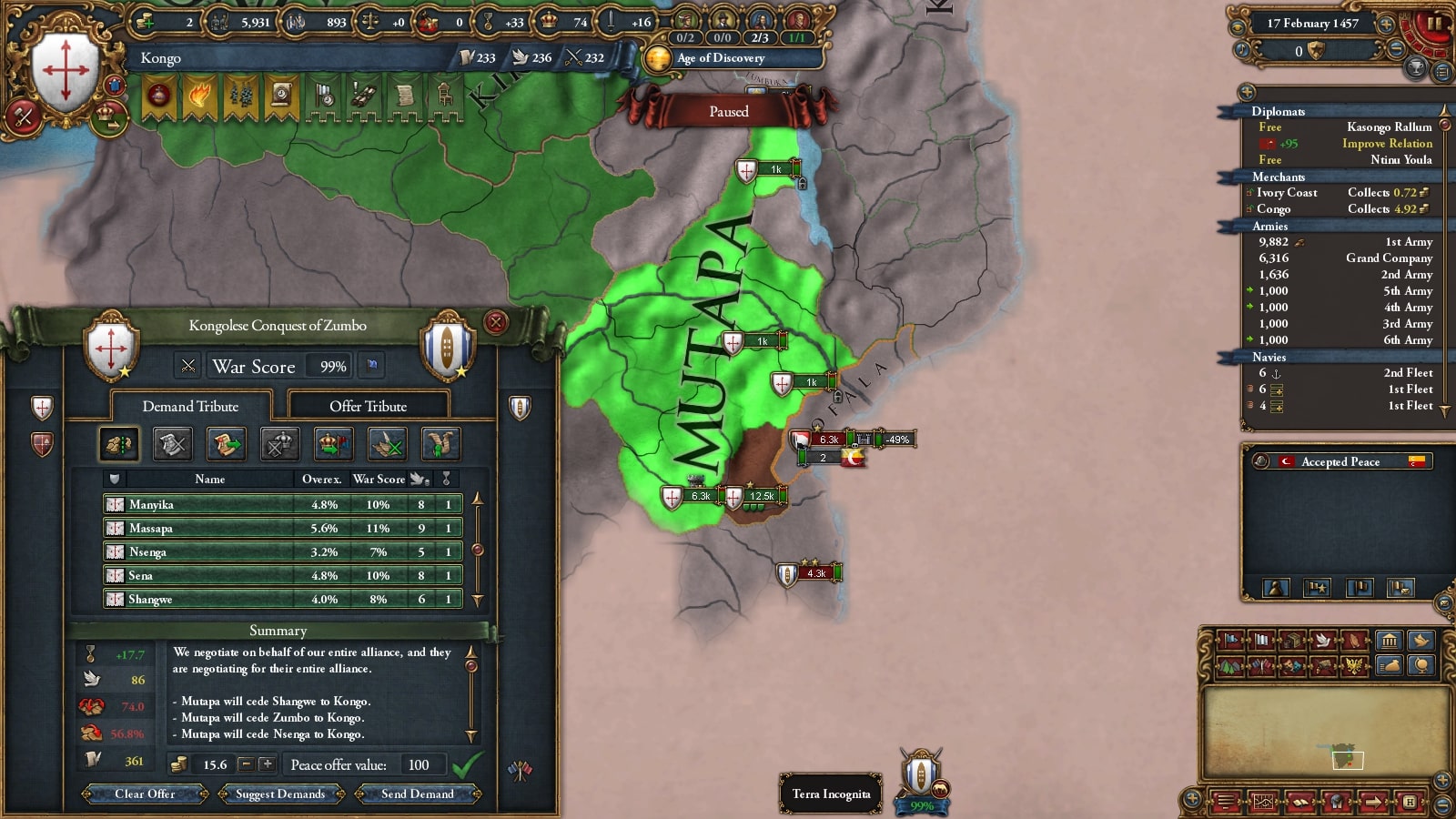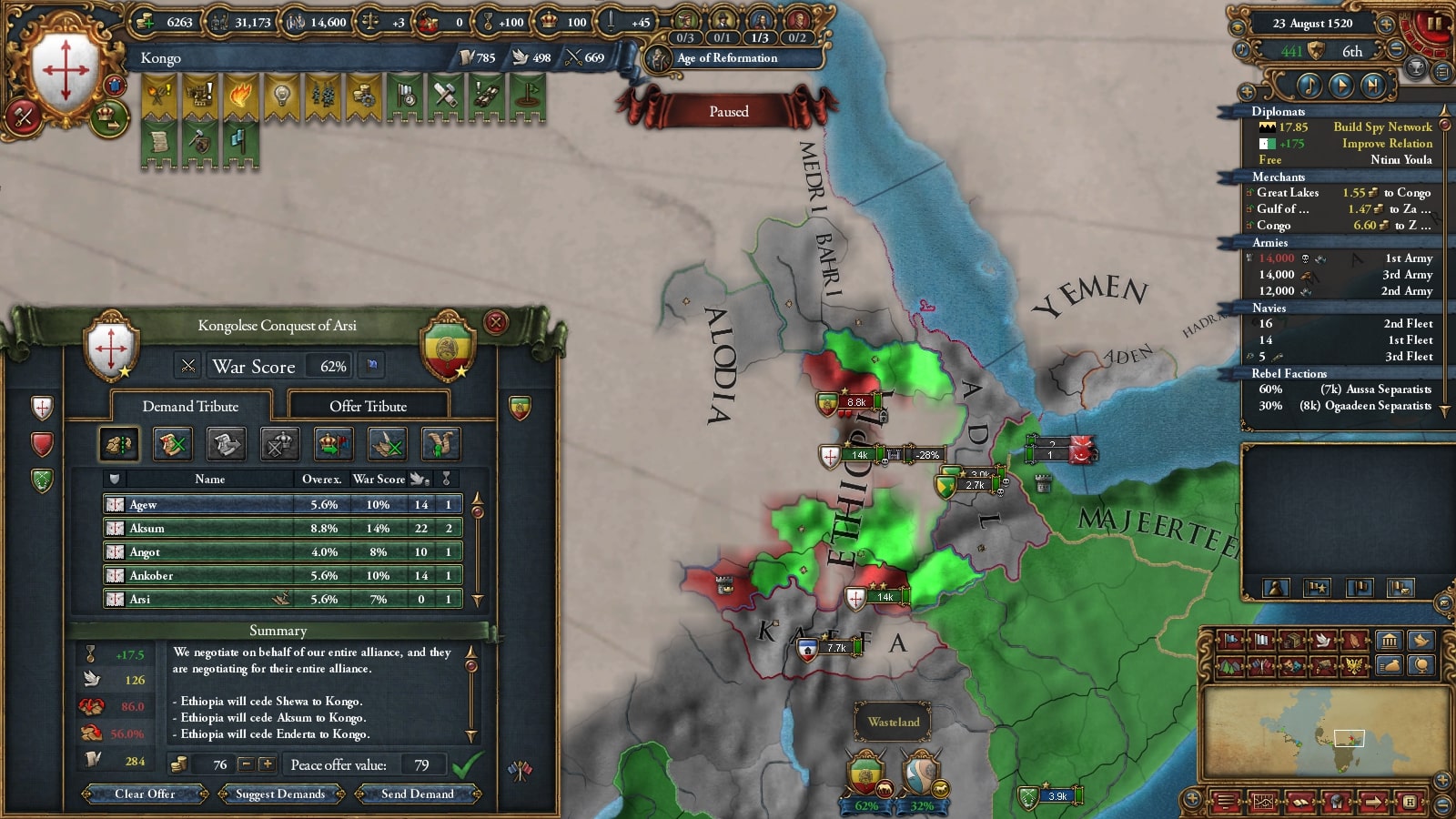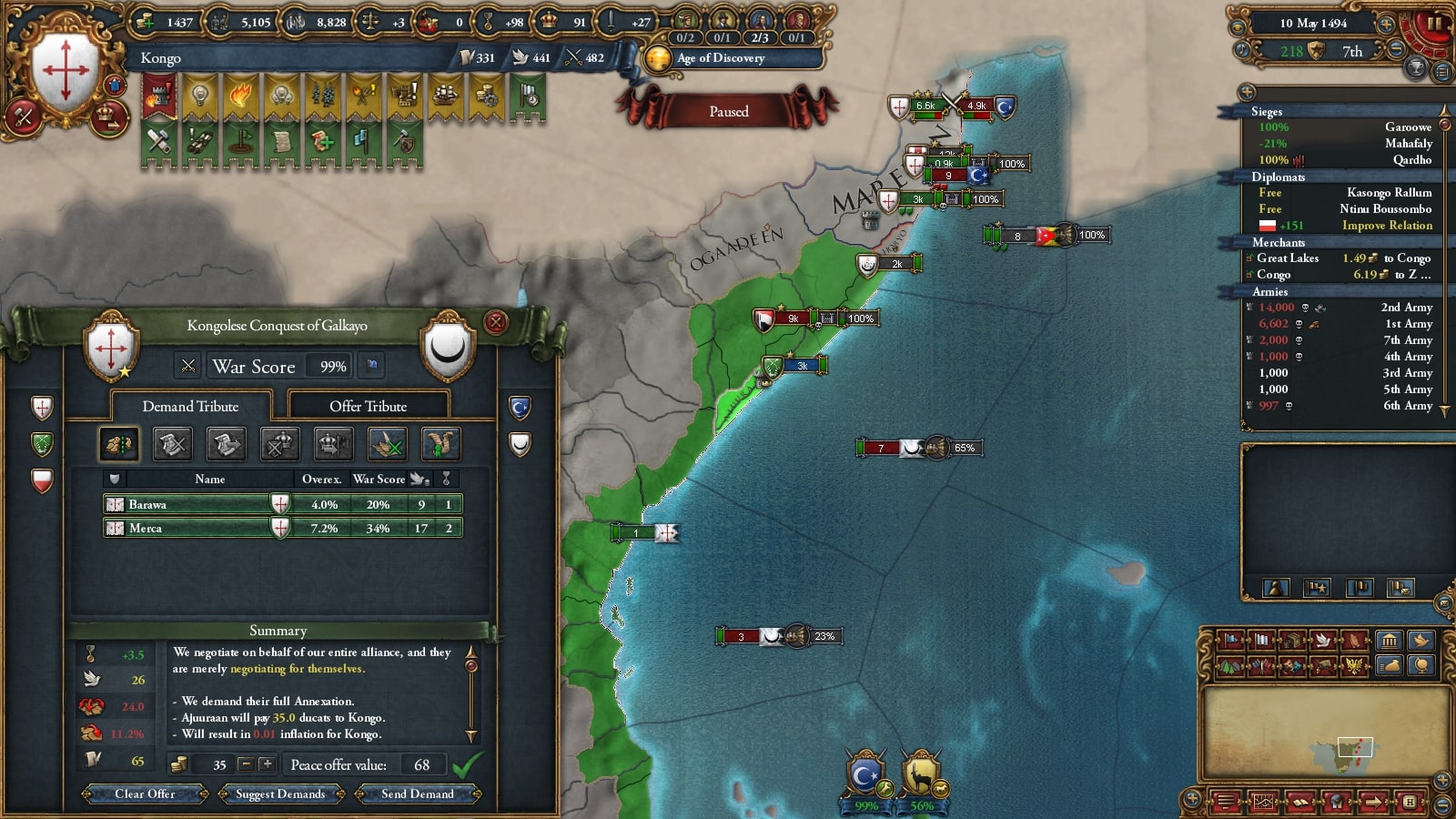 イフェ獲得による宣教師確保、ブラジルまでの植民距離短縮を狙ってベニンに宣戦していました。見づらいですが(申し訳ない)沿岸部をすべて割譲しています。