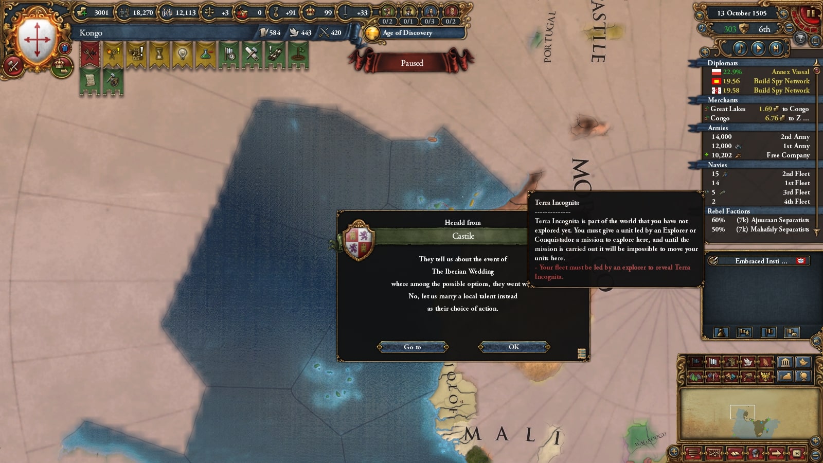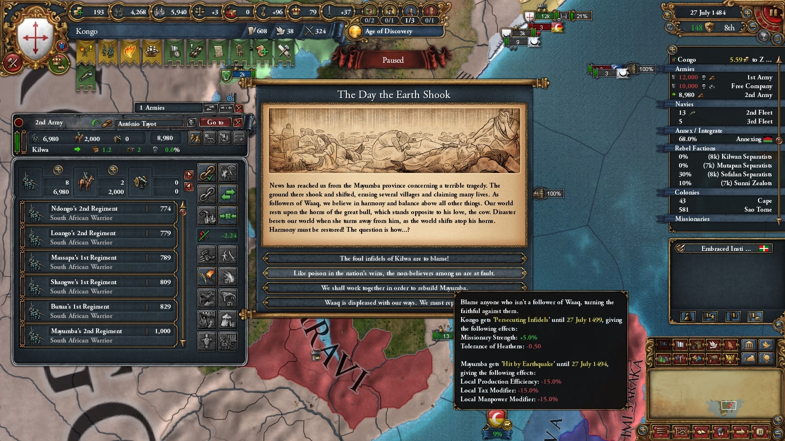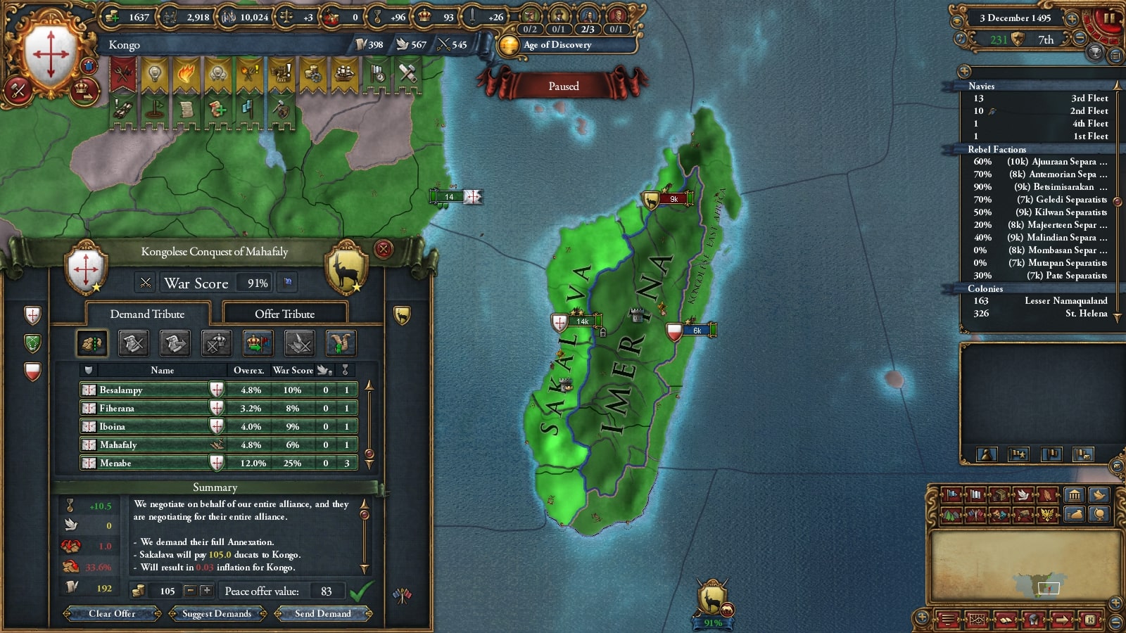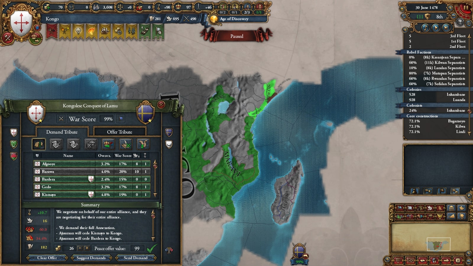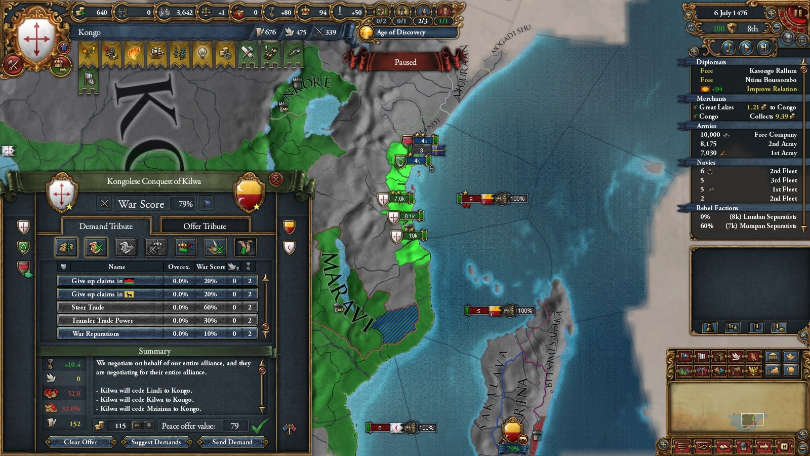 イフェ獲得による宣教師確保、ブラジルまでの植民距離短縮を狙ってベニンに宣戦していました。見づらいですが(申し訳ない)沿岸部をすべて割譲しています。