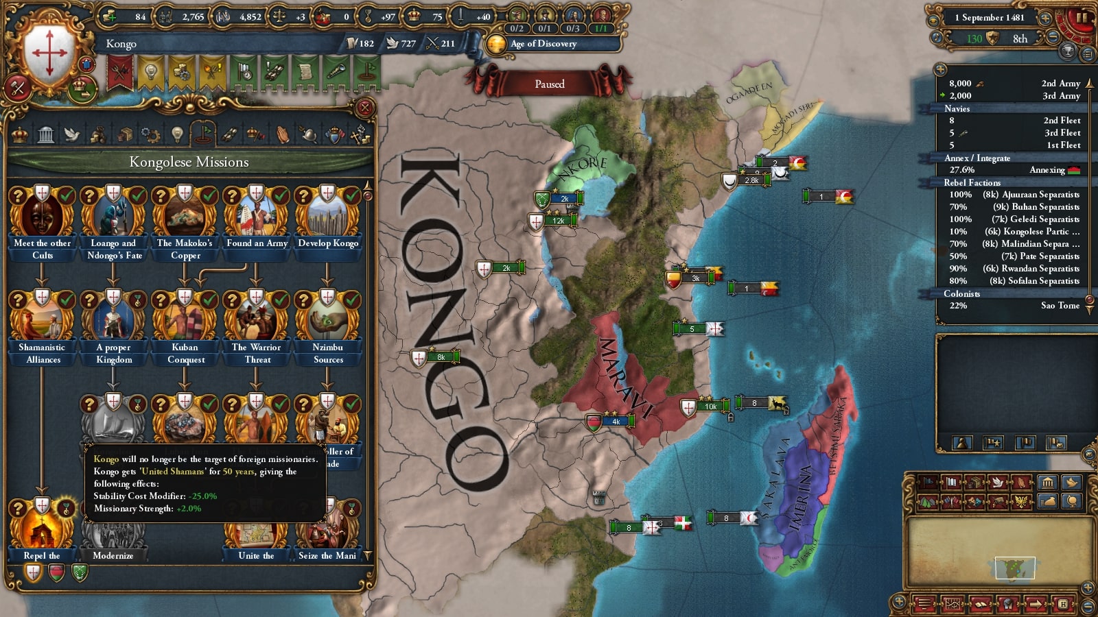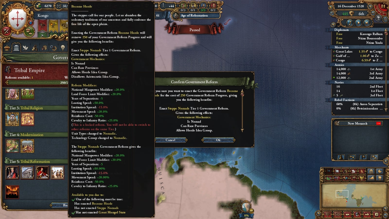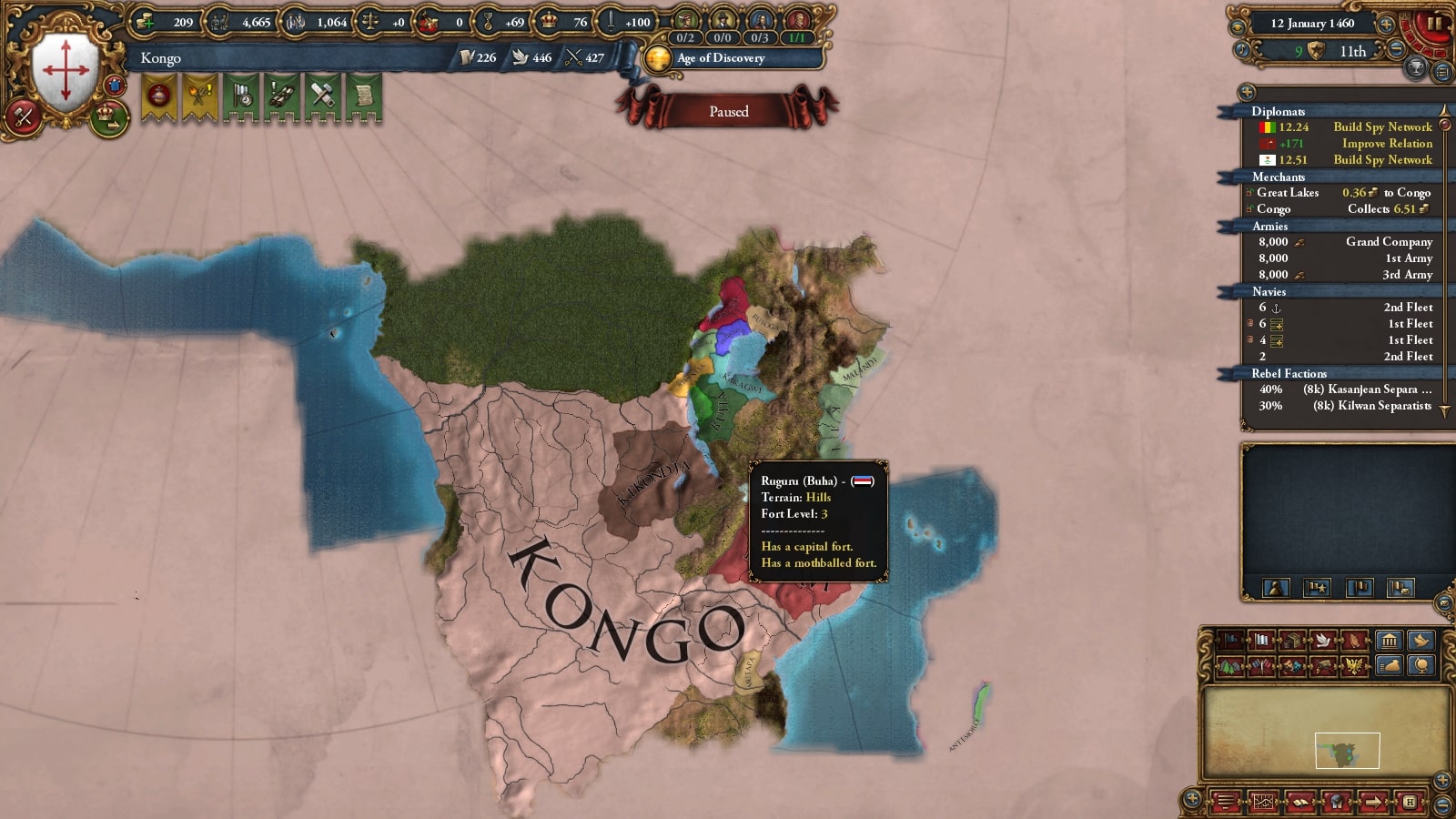 コンゴの序盤の最大の目標は遊牧民化です。そのため直轄地を確保し不足による自治度上昇を抑えて政府改革進捗度がたまるようにします。