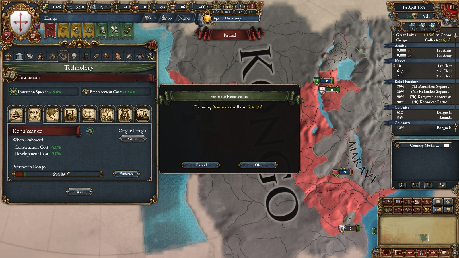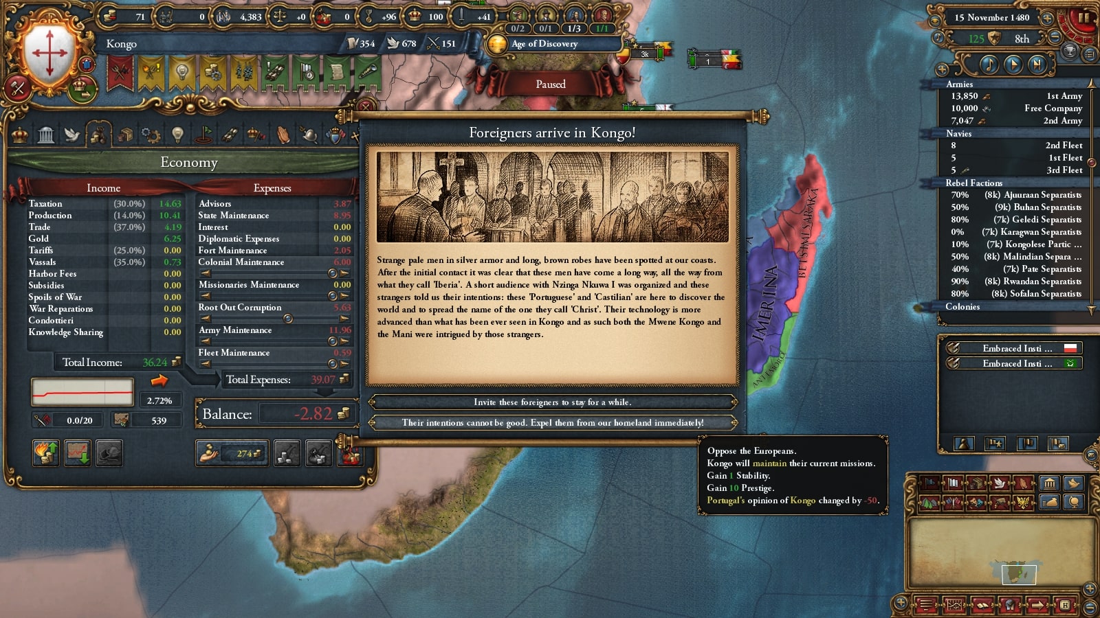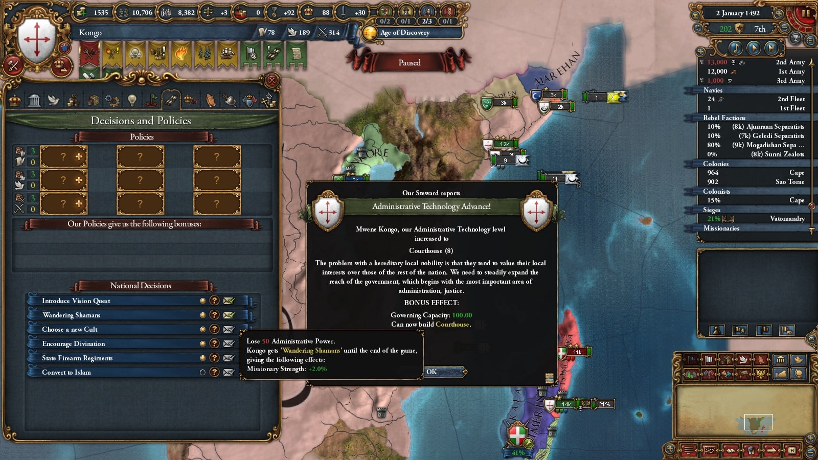 コンゴの序盤の最大の目標は遊牧民化です。そのため直轄地を確保し不足による自治度上昇を抑えて政府改革進捗度がたまるようにします。