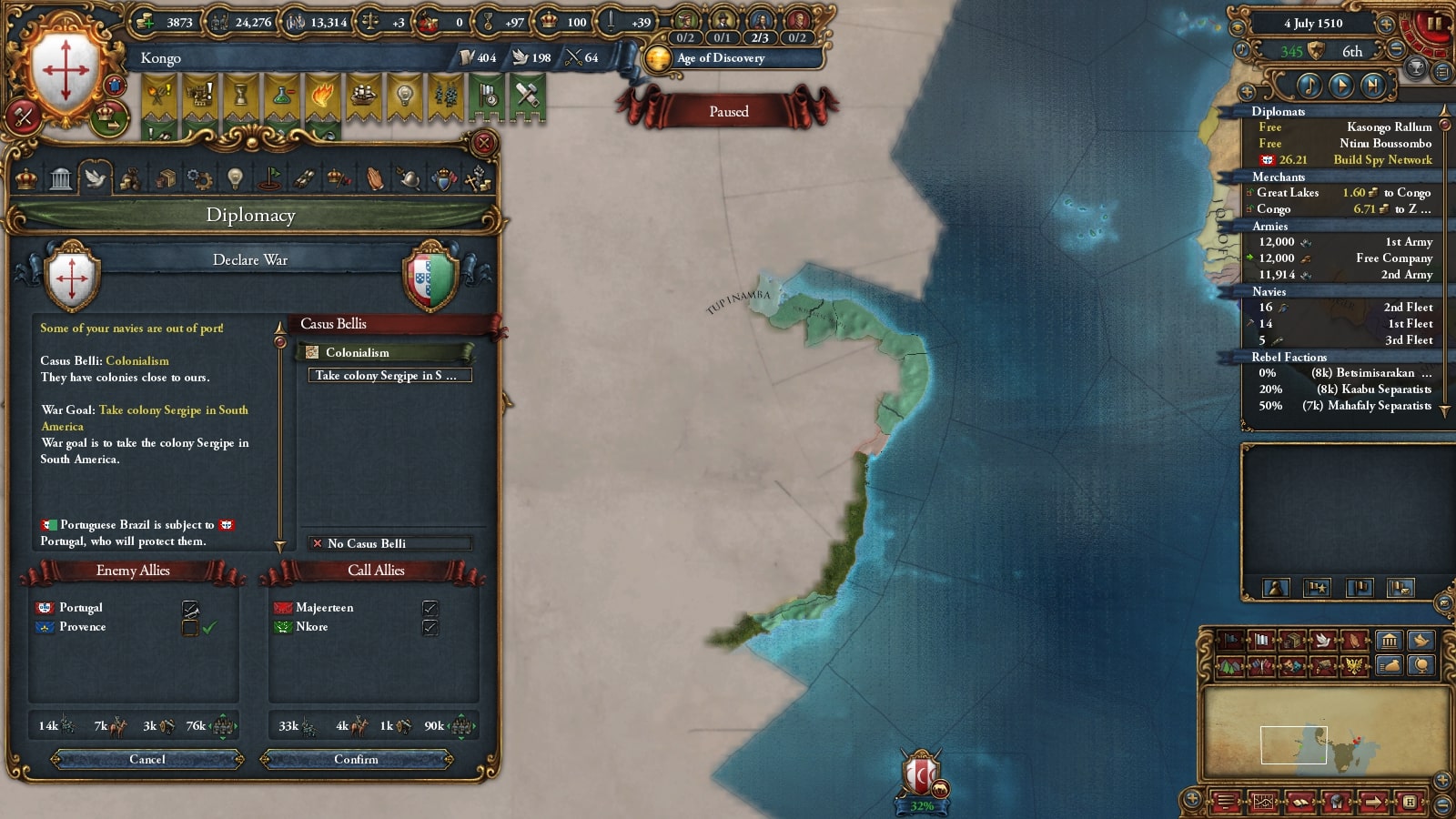 アダル戦の途中ですが先ほどの影響かポルトガルとカステラの同盟が切れており、イングランドとも切れていたのでブラジル植民地を奪いに行きます。非常に運がいいですね。