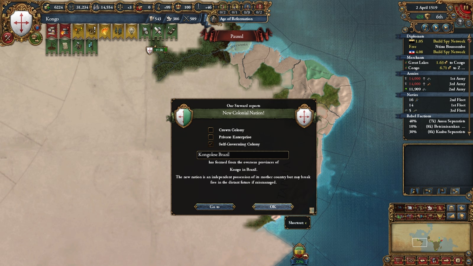 新大陸はこれから画像に移っている12k(最終的に40kにふくれて反乱軍に負けて消滅する)が宣戦や和平の強制によって植民地を拡大させていきます。
