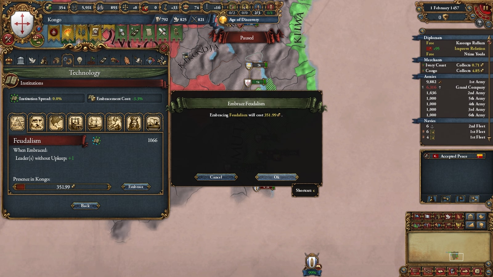 戦前から進めていた初期属国の併合が終わりミッション報酬で封建制を受容します。