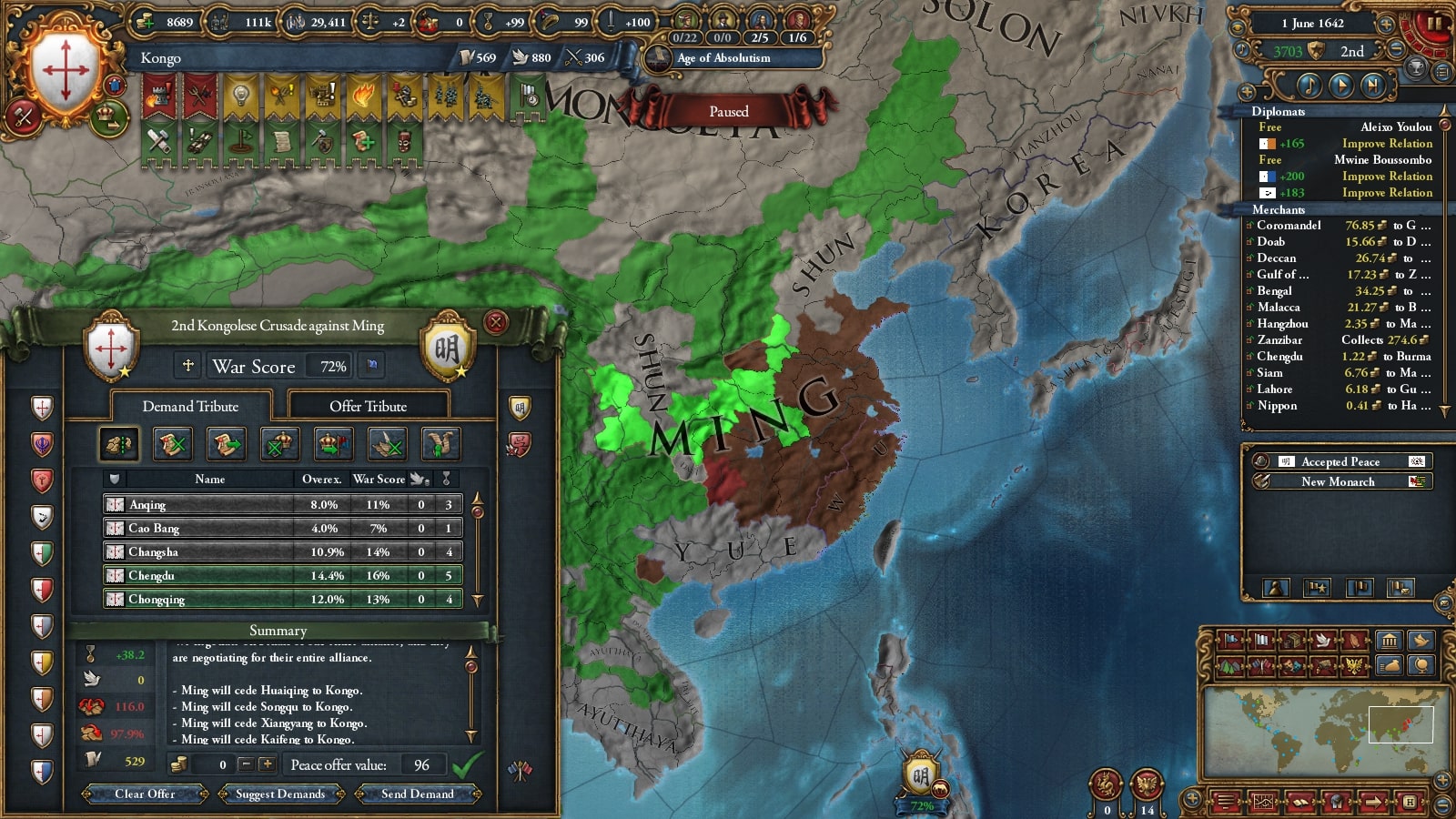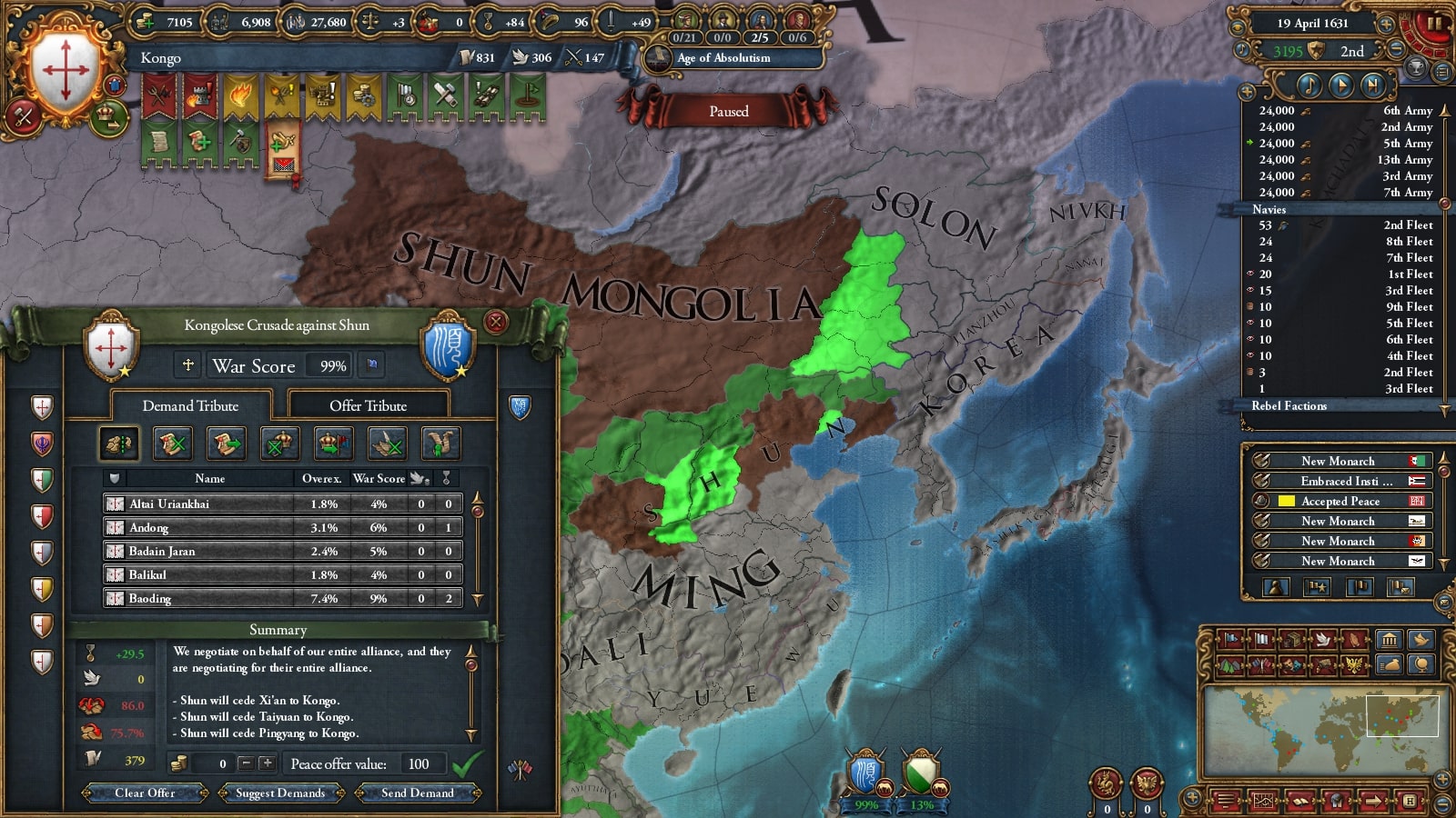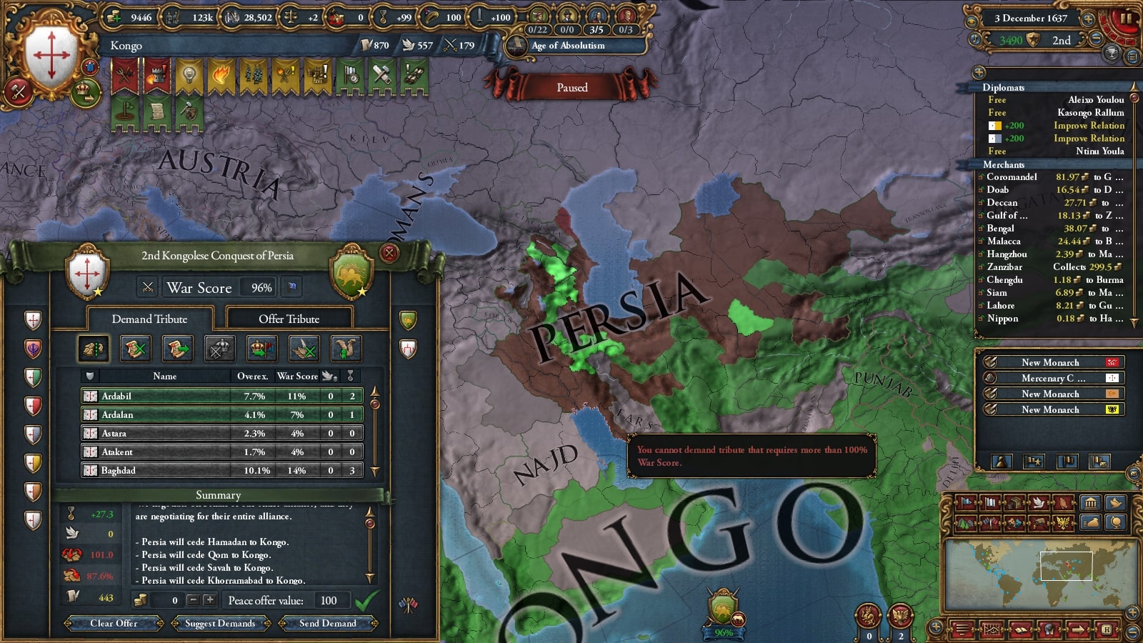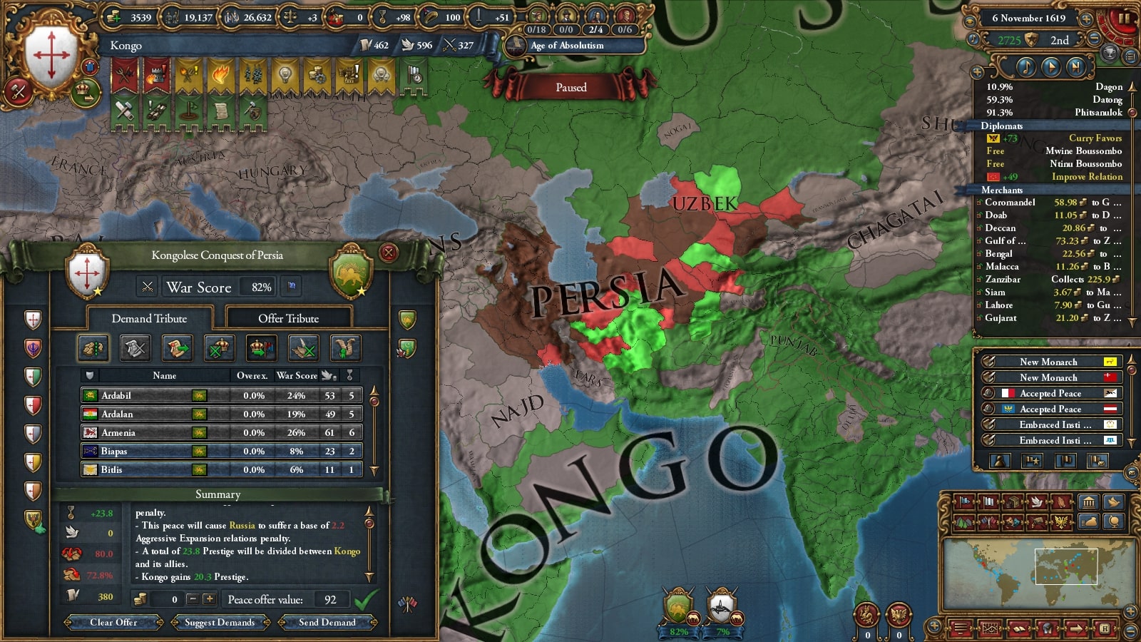 AEが慢性的にたまってきているので同盟国に負け講和して西アフリカのクソデカ朝貢国を開放しています。