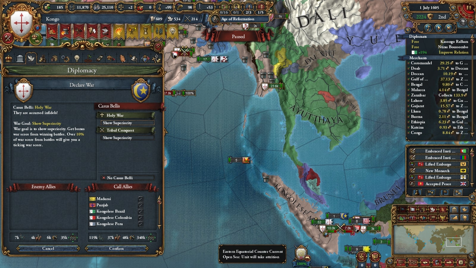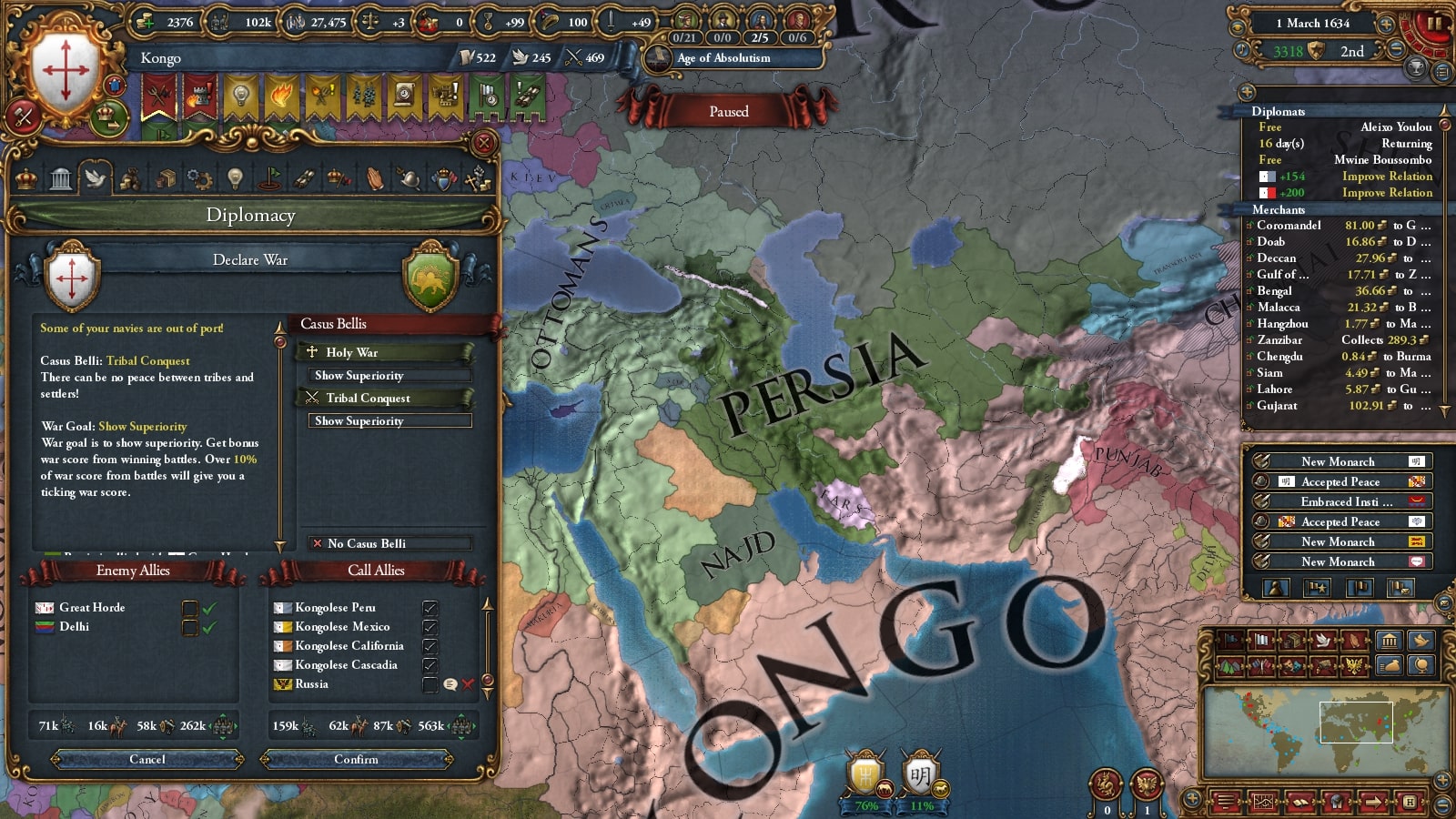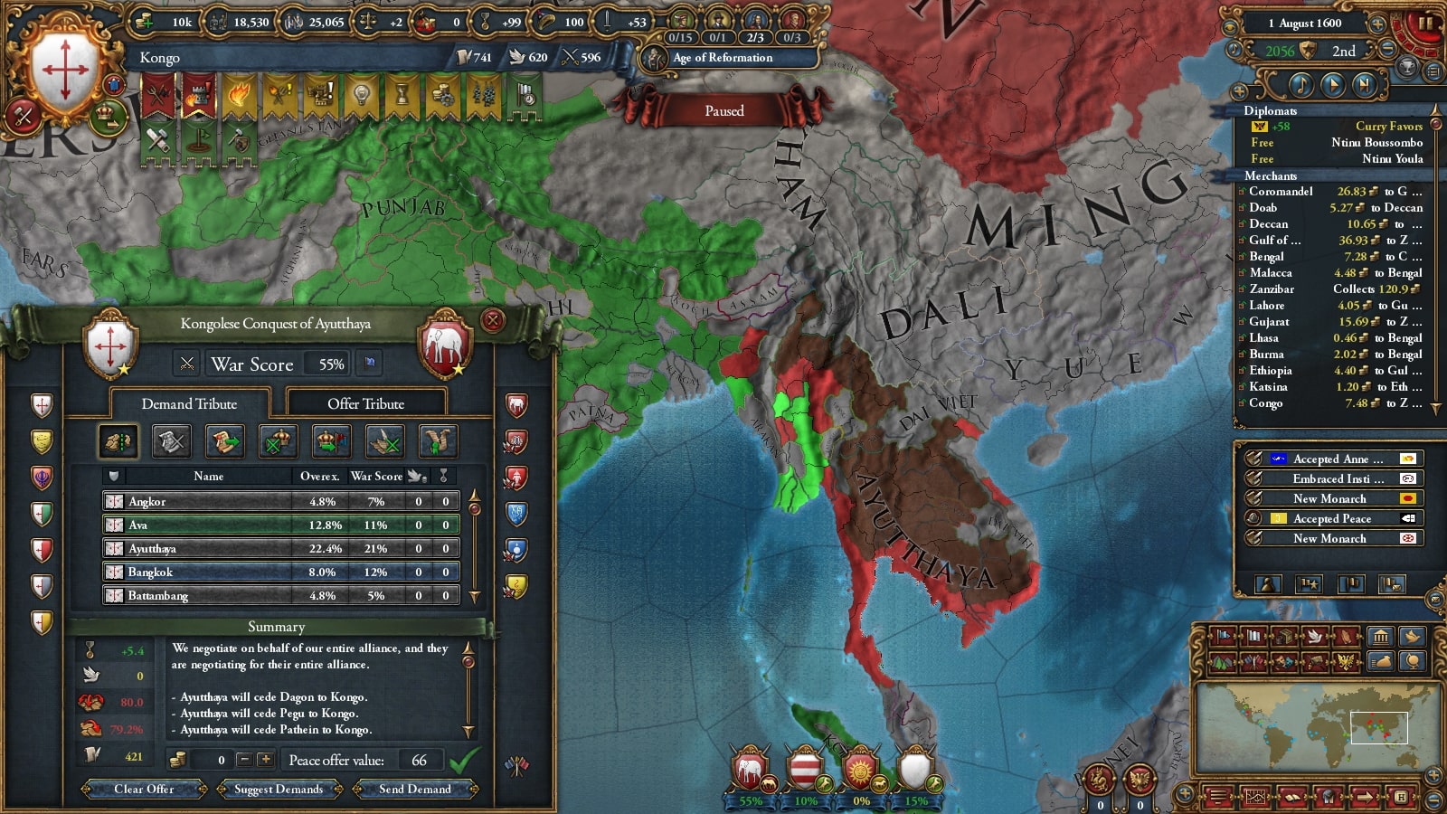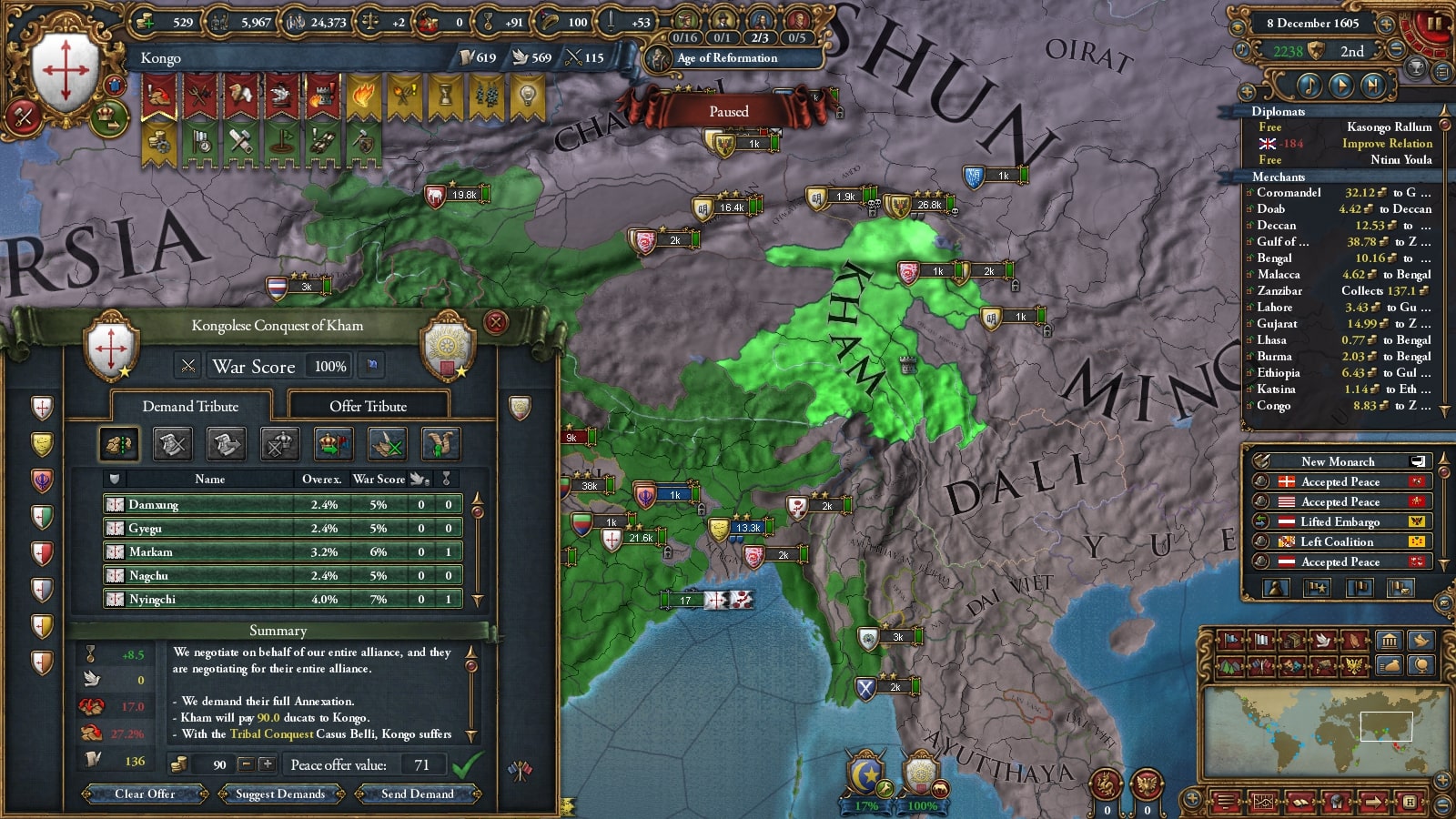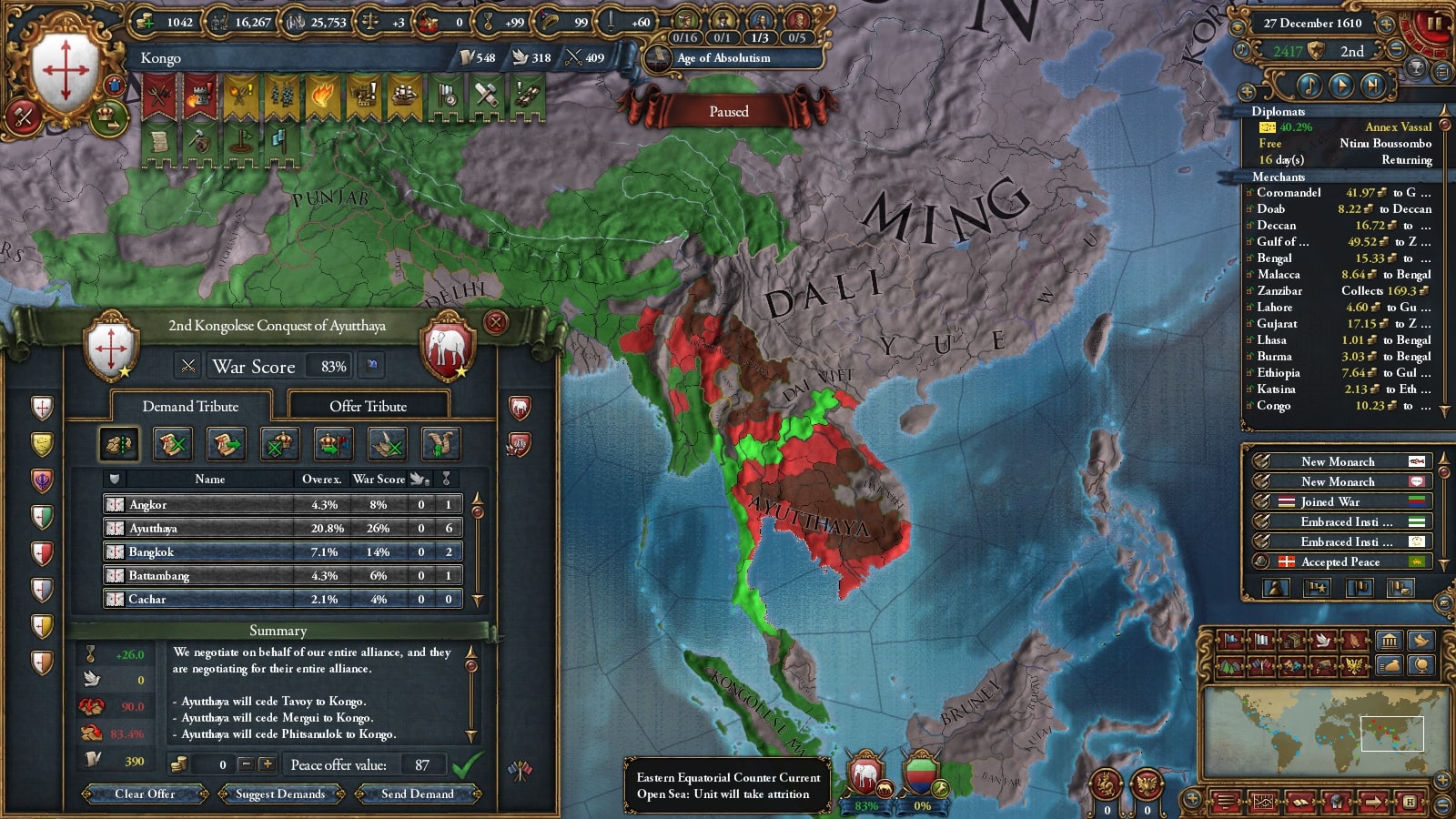 AEが慢性的にたまってきているので同盟国に負け講和して西アフリカのクソデカ朝貢国を開放しています。