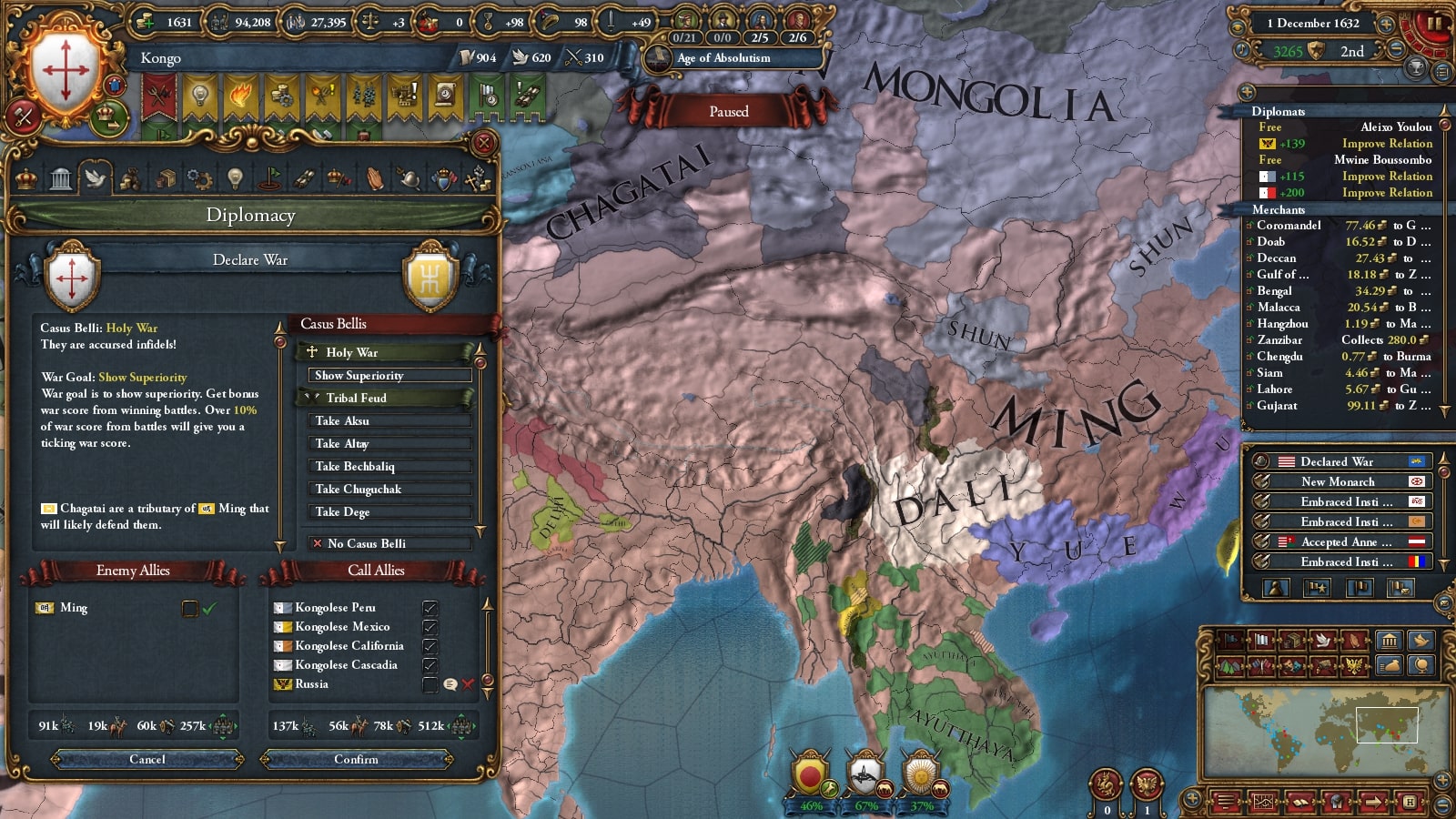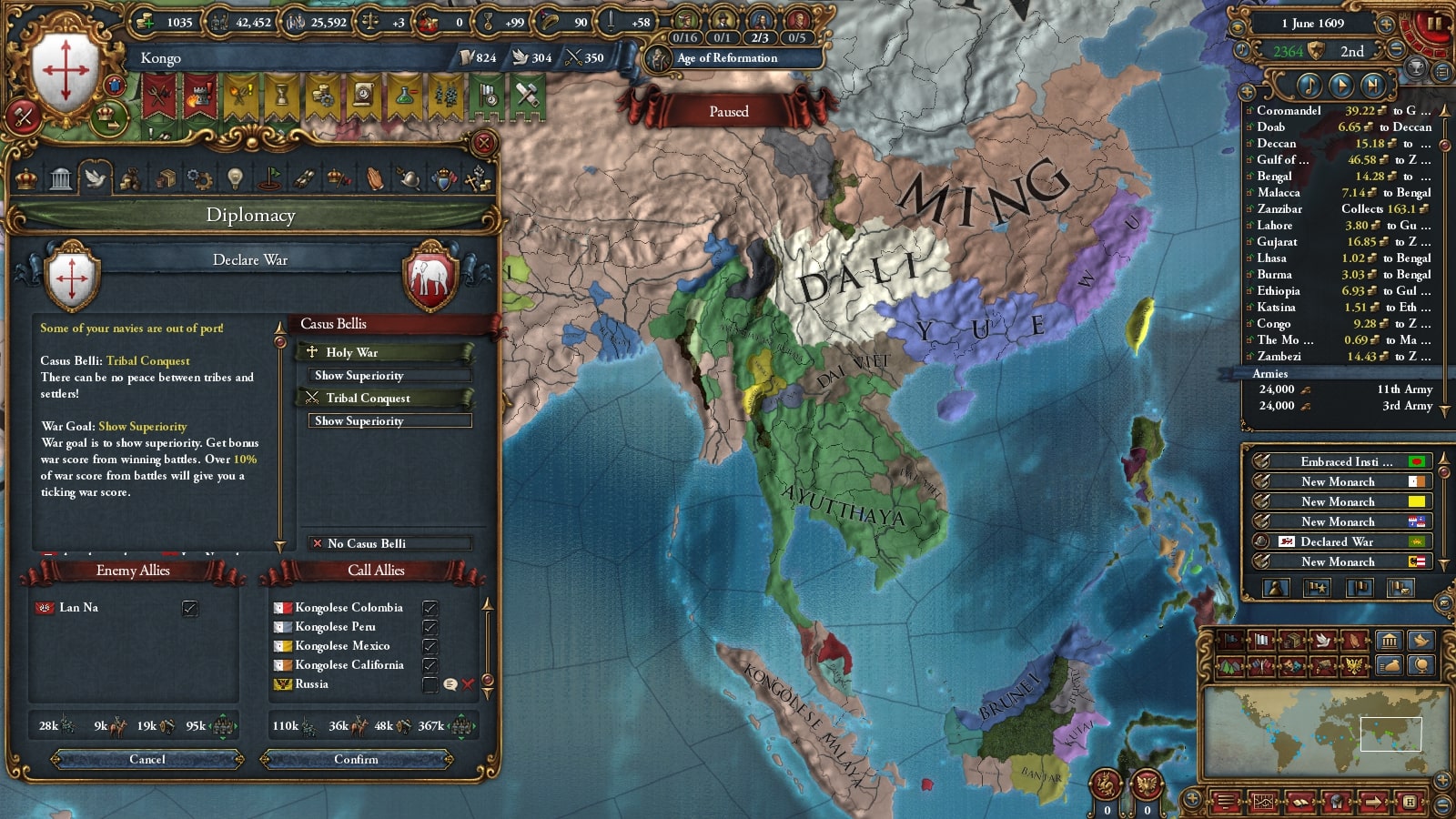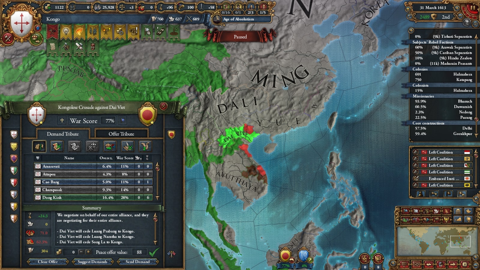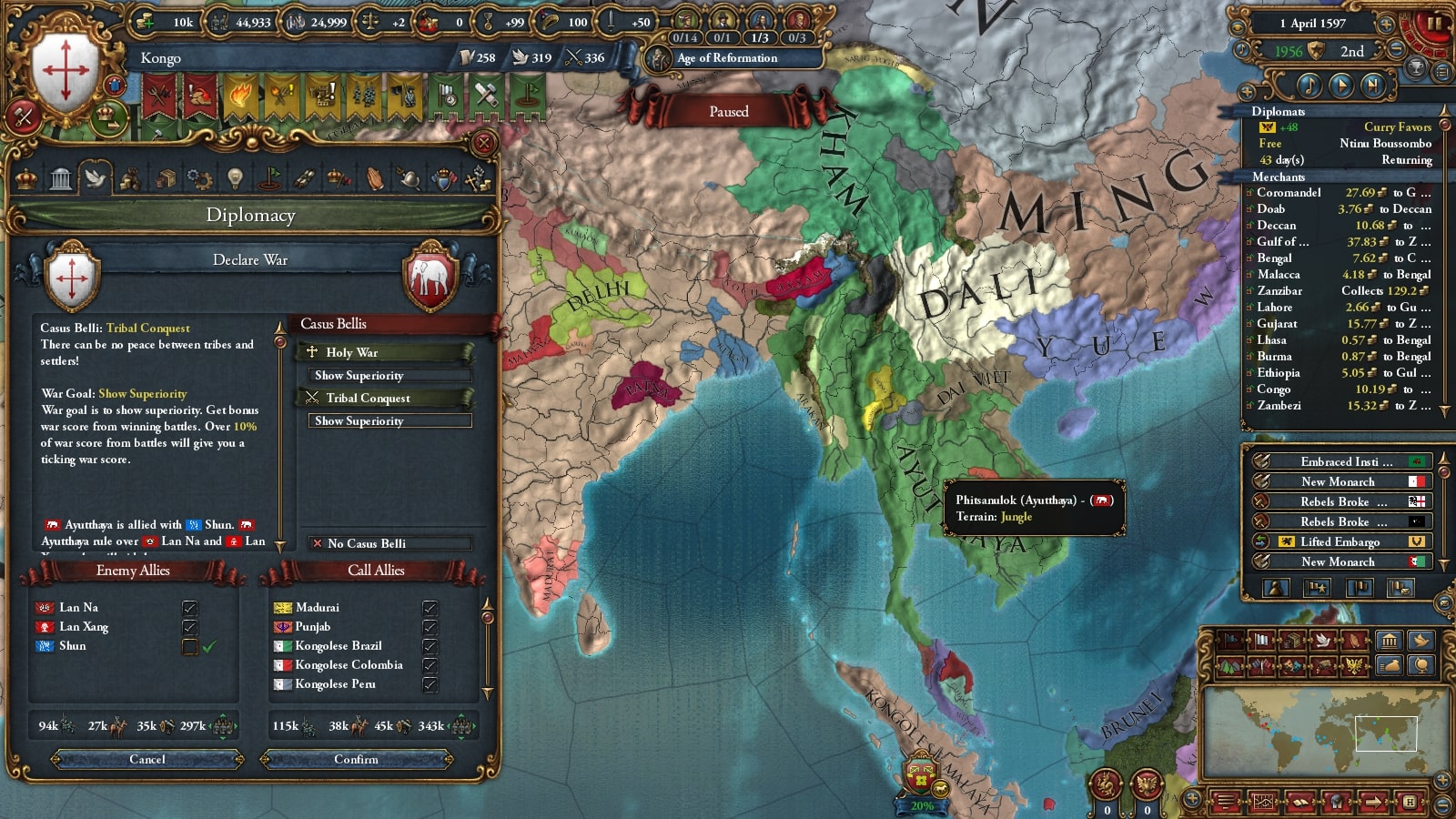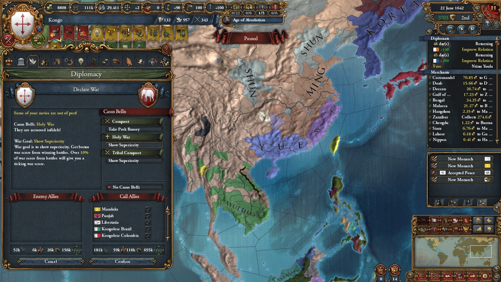 アユタヤ戦のコア化が全く終わっていませんがオスマンを中心とした包囲網が膨らみそうだったので阻止しに行きます。適当に講和しておきます。