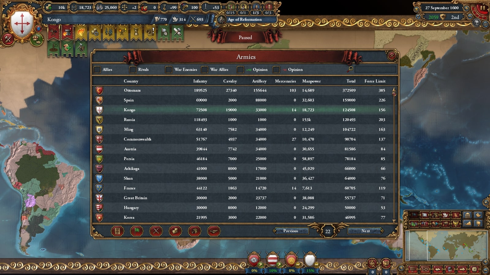 まだ軍量アイデアを取っていない上に内政ガバガバなので陸軍数は3位です。オスマンがダルルスコアをつけています。
