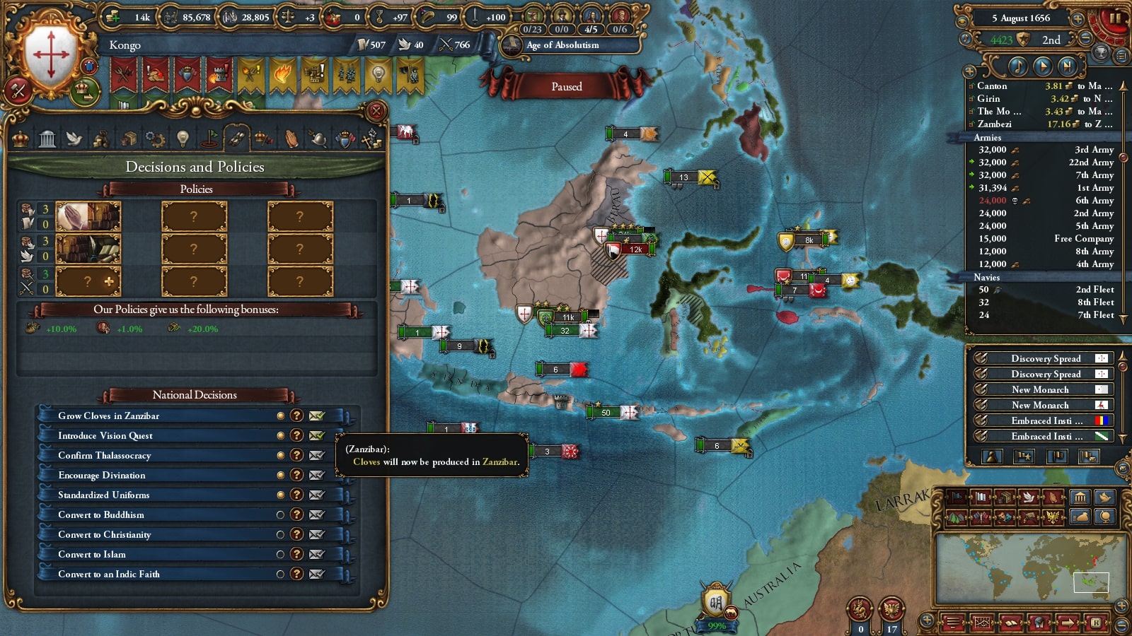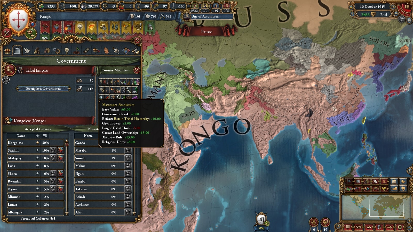 絶対主義の最大値はミッション報酬のおかげで例の国難を発動しなくても100を超えてきます。