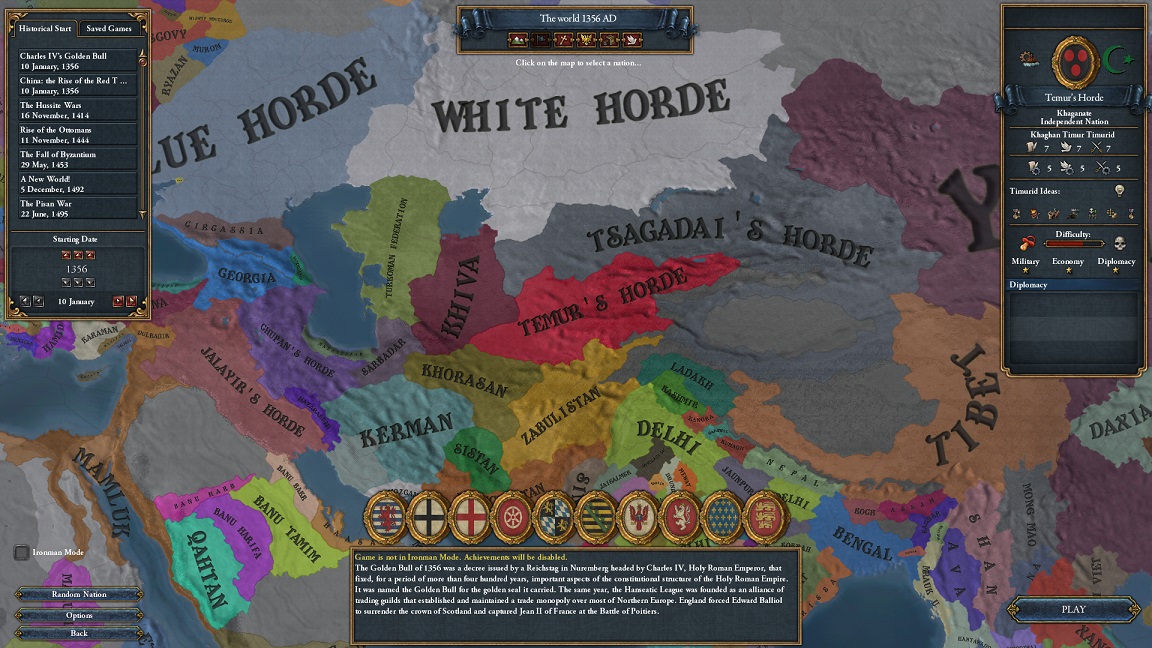 でもM&Tの最近のバージョンだと(というかv1.08以降のバージョンだと)、ティムール帝国は1356年からプレイアブルじゃないんですよね。