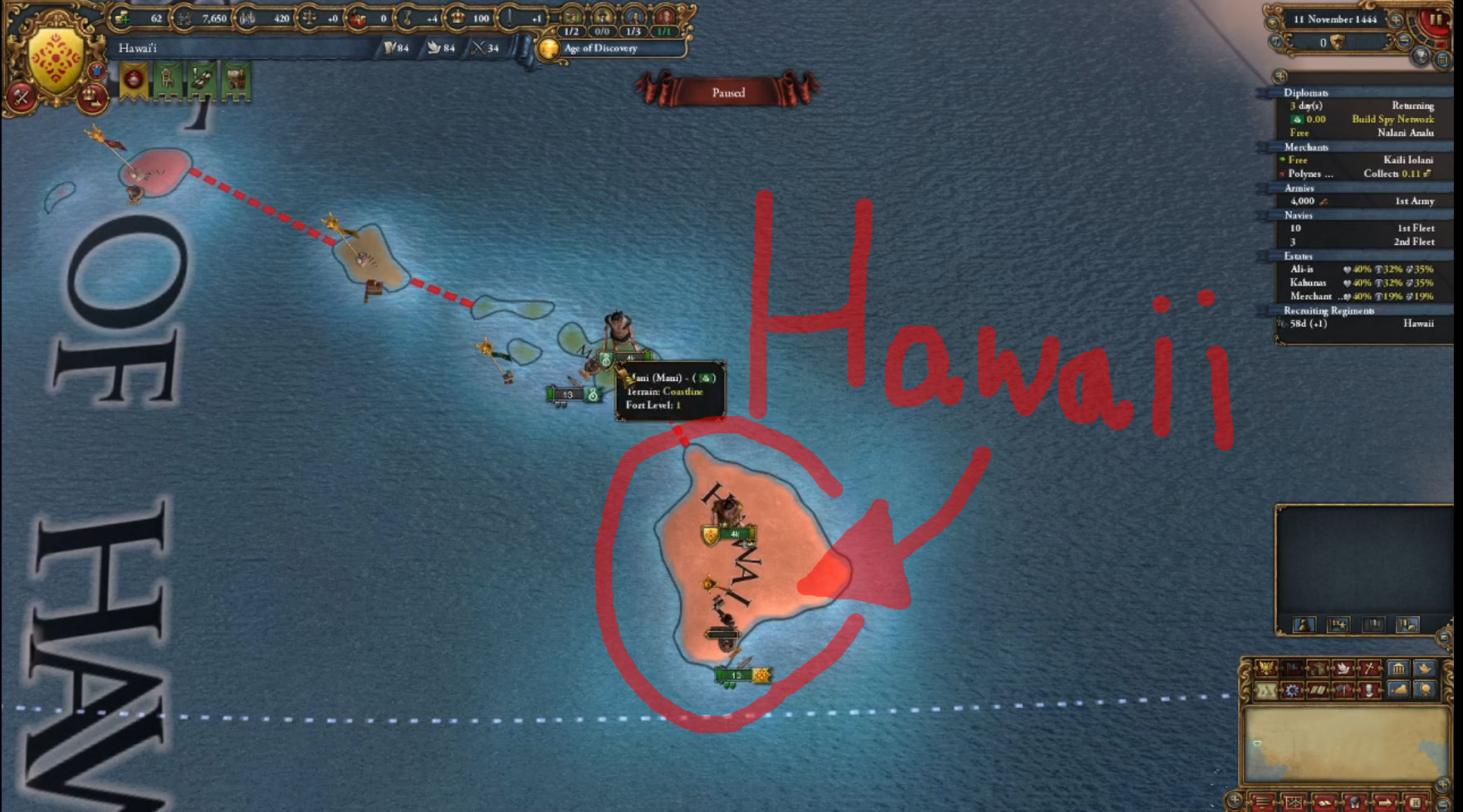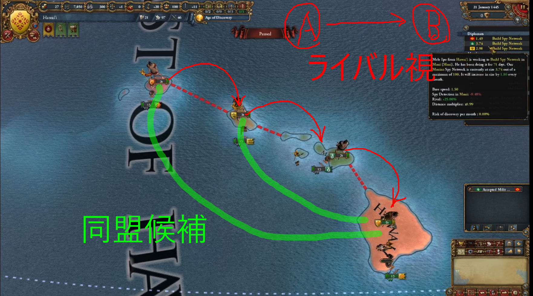 ・カウアイ(一番遠い):ライバル視されておらず地理的にも最後に滅ぼす国としては最適。ただし敵我が国のライバルマウイとも同盟しかねない。