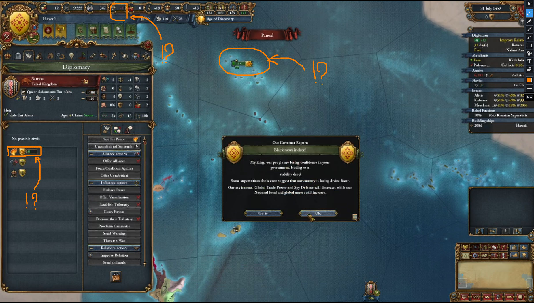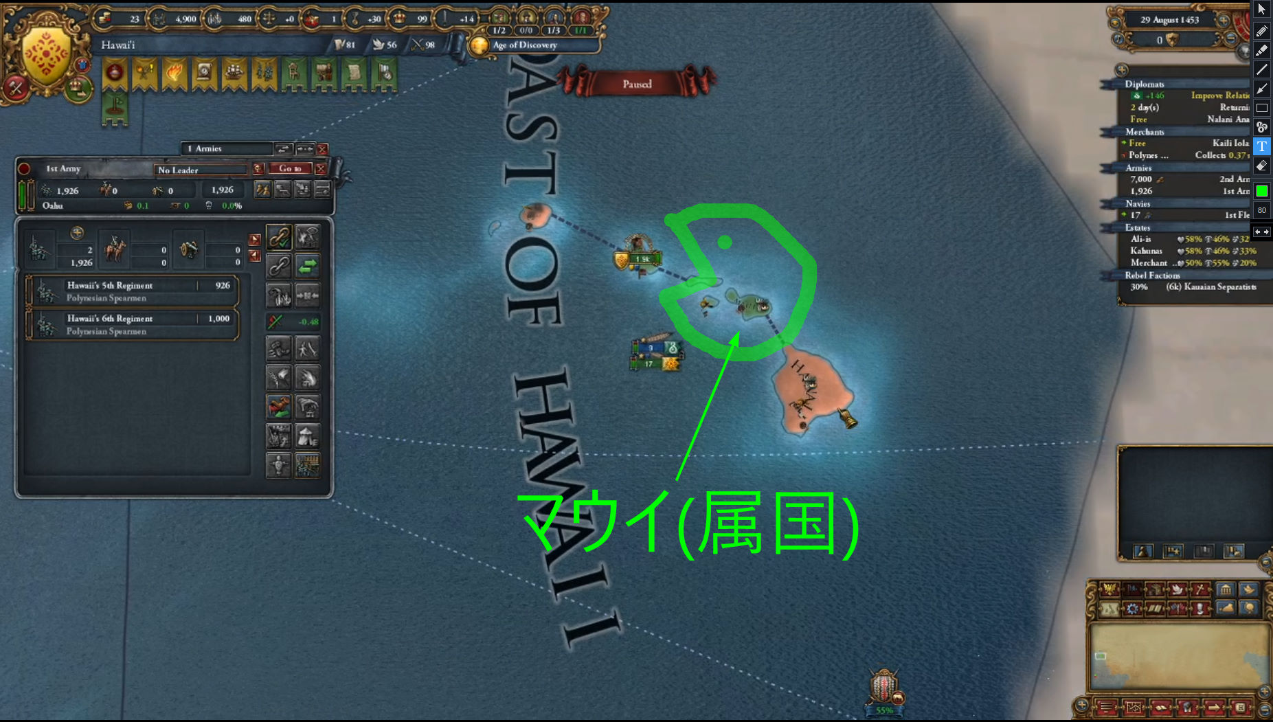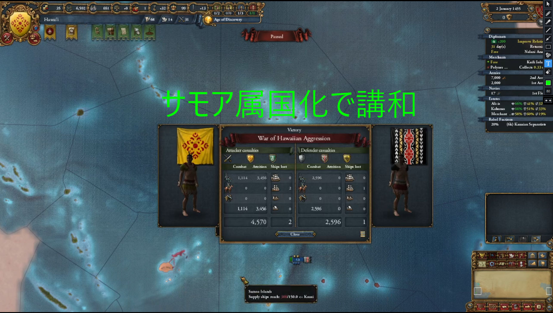 ただし、属国海軍は自国の近くで起こった海戦には結構来てくれるのでトンガ軍がサモア占領中のハワイ軍を無視して直接ハワイに上陸しようとしても撃退は可能(一応ガレー船を二隻作っておいたので多分勝てる、来なかったけど…)。