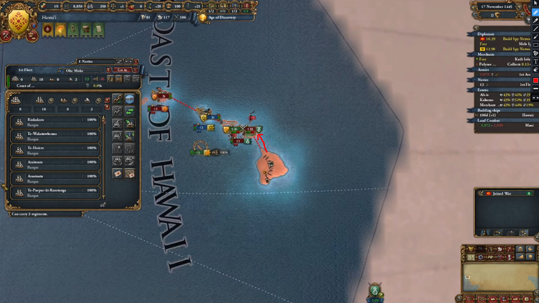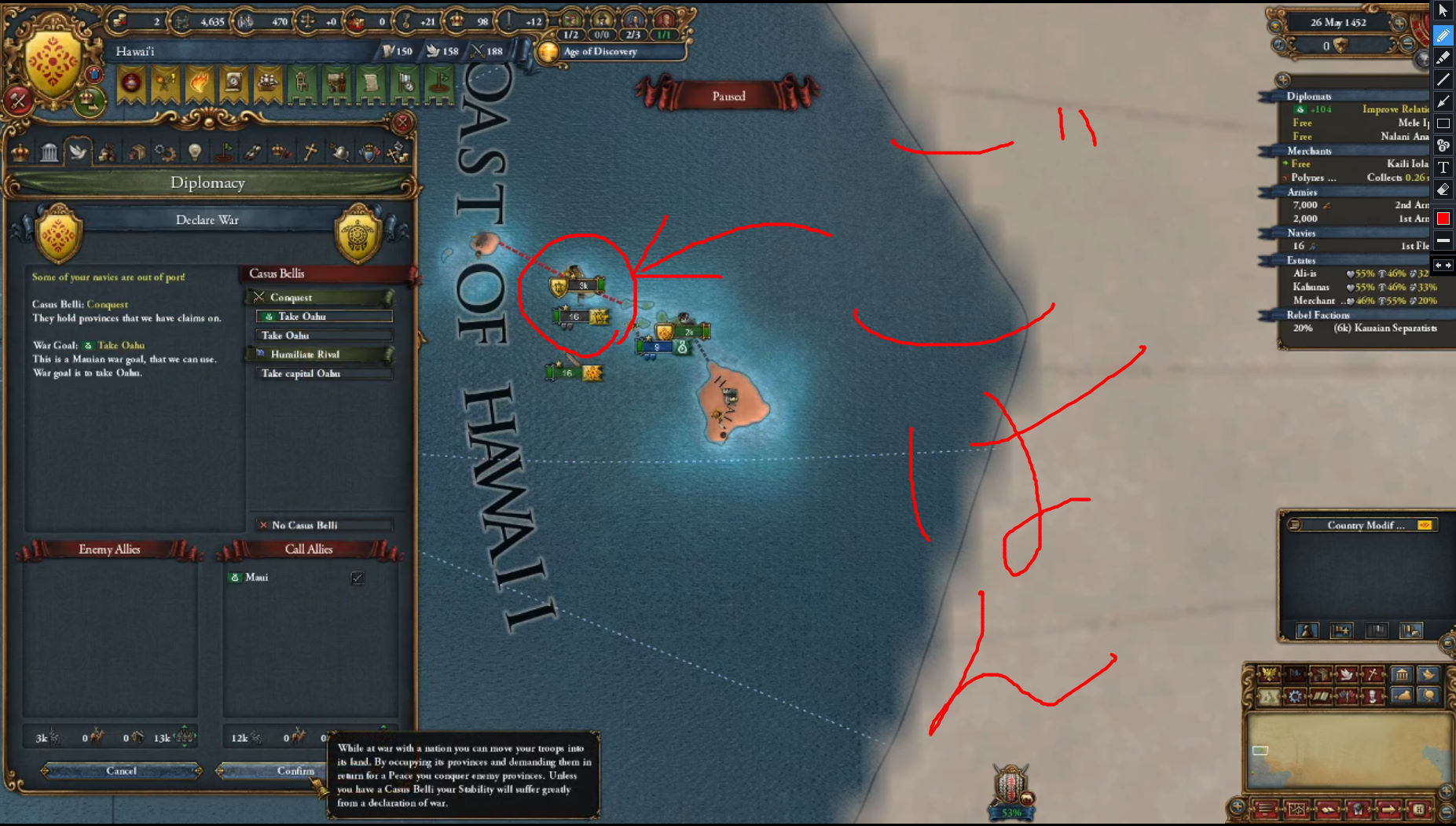 というわけでオアフに決定!予定通りマウイとカウアイが同盟したのでマウイに請求権をつけて戦争を吹っ掛ける。