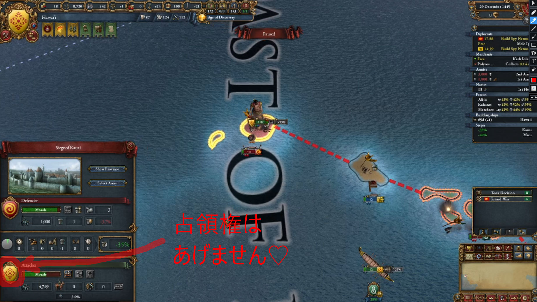 あとは包囲して終了、カウアイは併合したけど手早く船が欲しいのでマウイは属国にした。オアフが何か言いたげにこちらを見ていたので空気を読んで同盟を切った。今日もまた一つ徳を積んだ気がする。