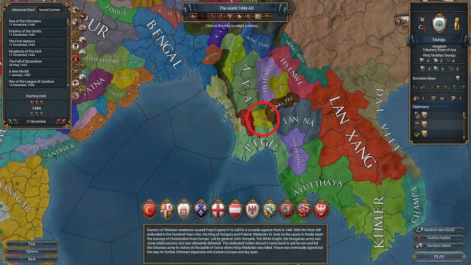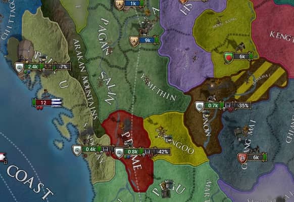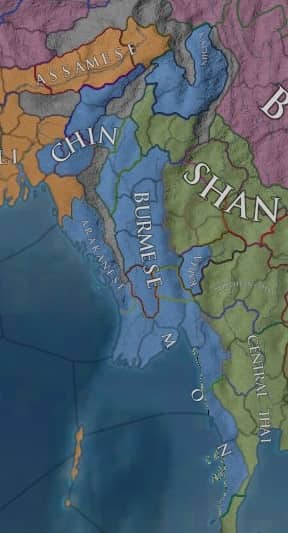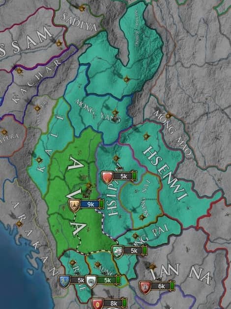 バージョン更新前はすぐにAyutthayaやlan Xangと同盟を組み苦しめられた存在ですが、今回の同盟国は周辺の弱小勢力のみ。