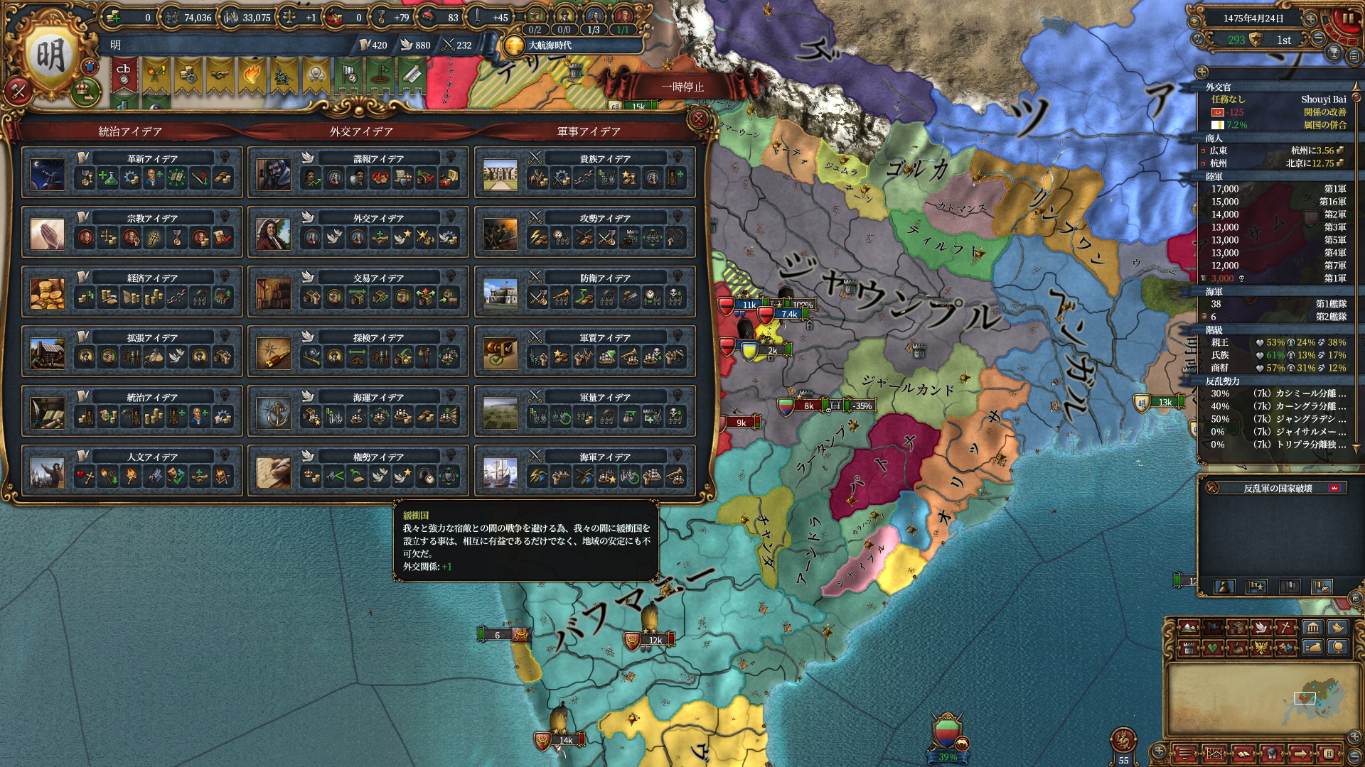 欧州は全く見えないので実態は分かりませんが、列強スコア的にはフランス・ブルゴーニュのスタートダッシュが決まっておりオスマンも滑り出しは順調といった感じです。