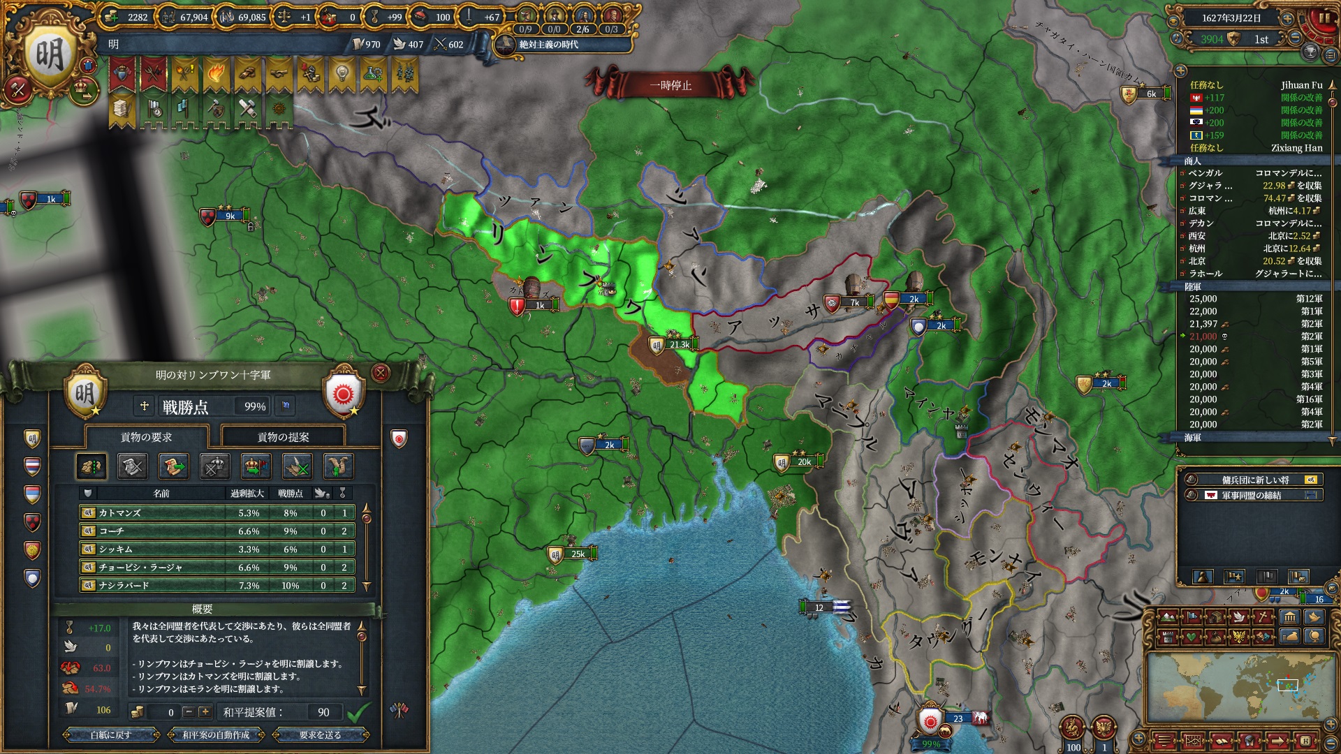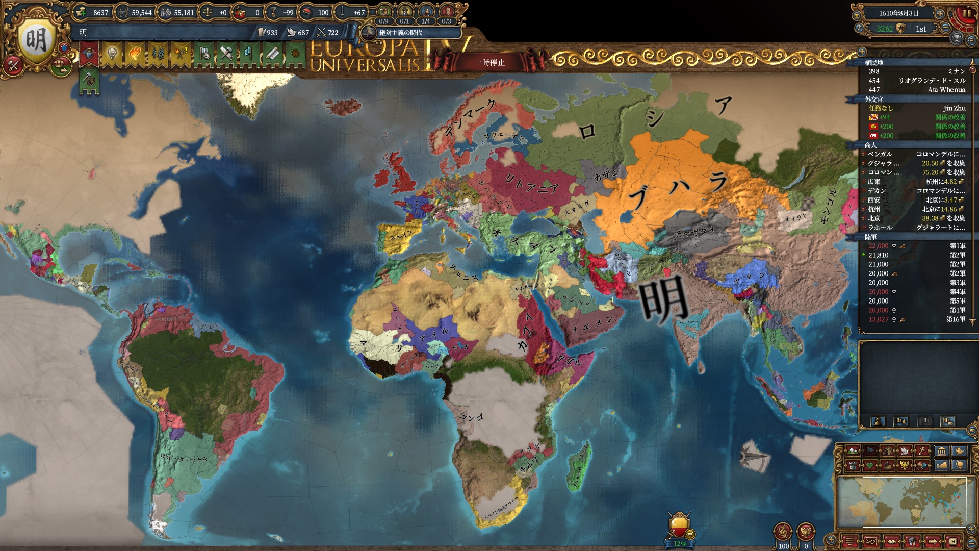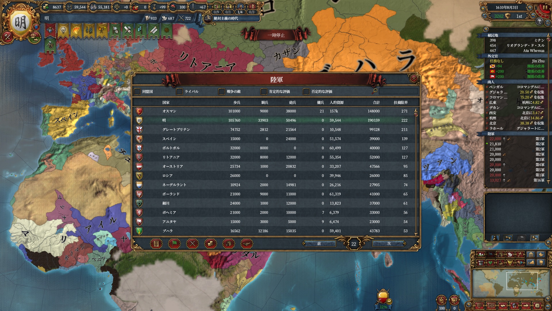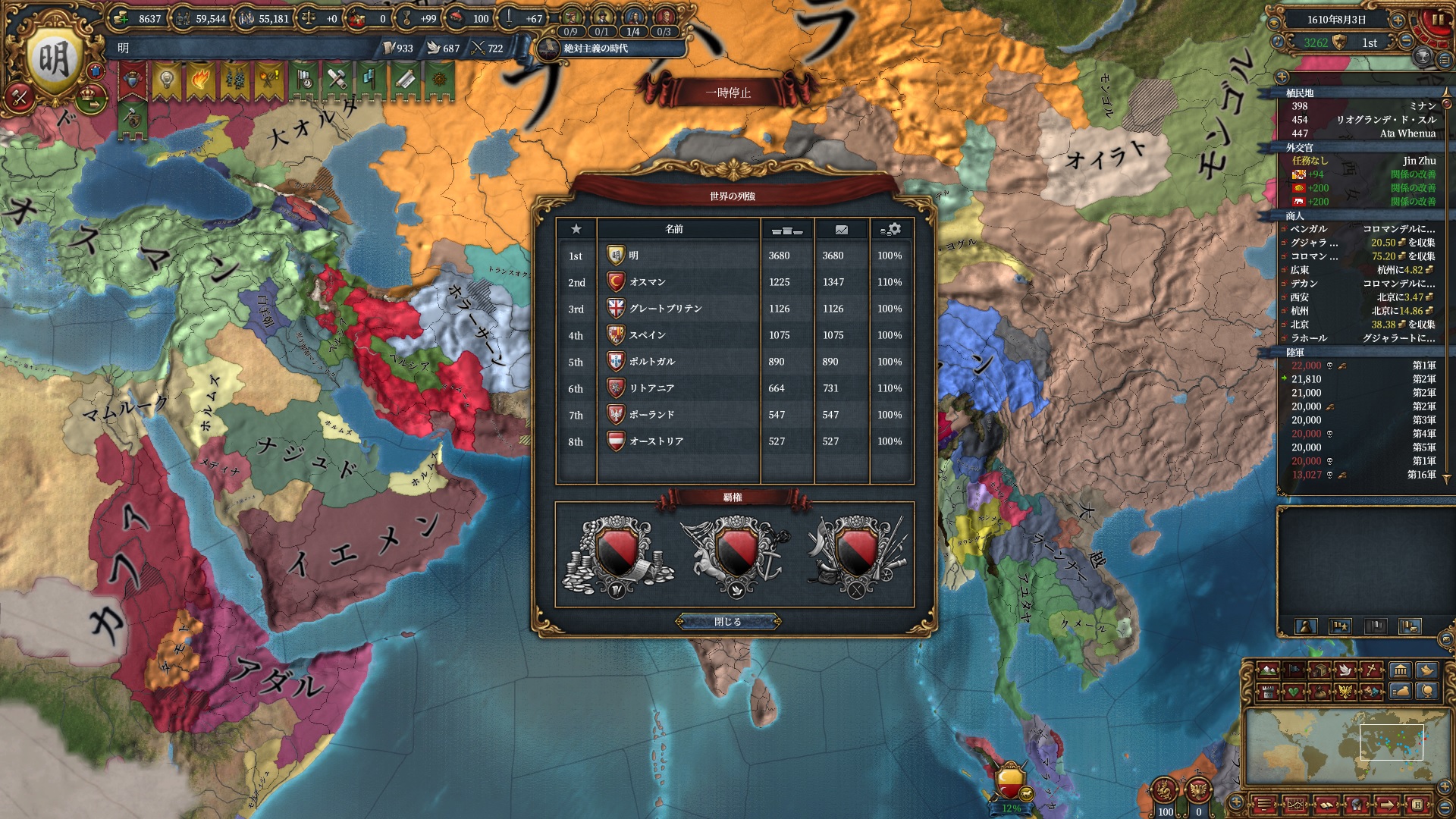 軍量を取り優秀な交易ノードを持つオスマン、イギリスが現時点では内政力・軍事力どちらも飛びぬけています。この2国は拡張し切る前に何発かぶん殴っておかないと間に合わなくなりそうです。