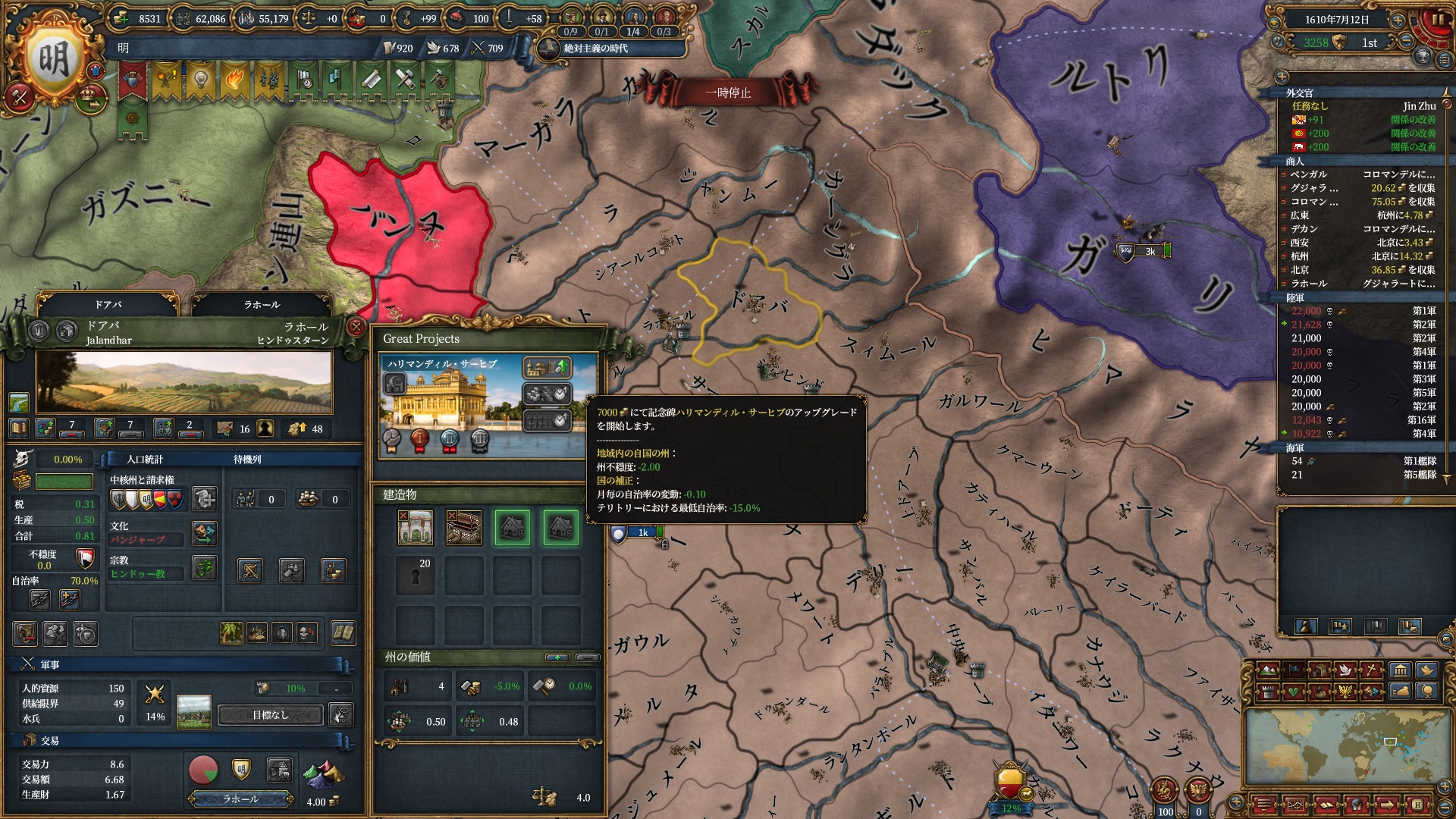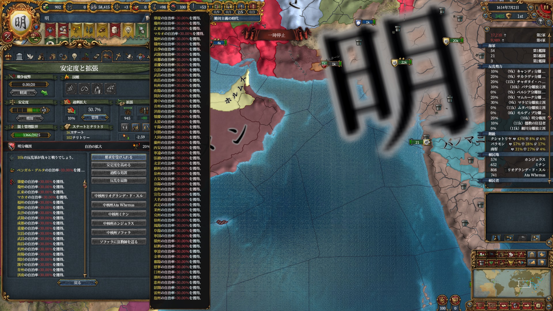 その後全力で自治度を下げ絶対主義を補充します。州に不穏度+10の補正が暫く付きますが国教州なら高い寛容度・高天命・安定度ボーナスで割と反乱を抑えてくれます。
