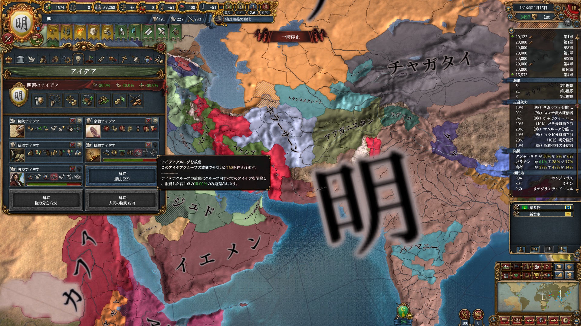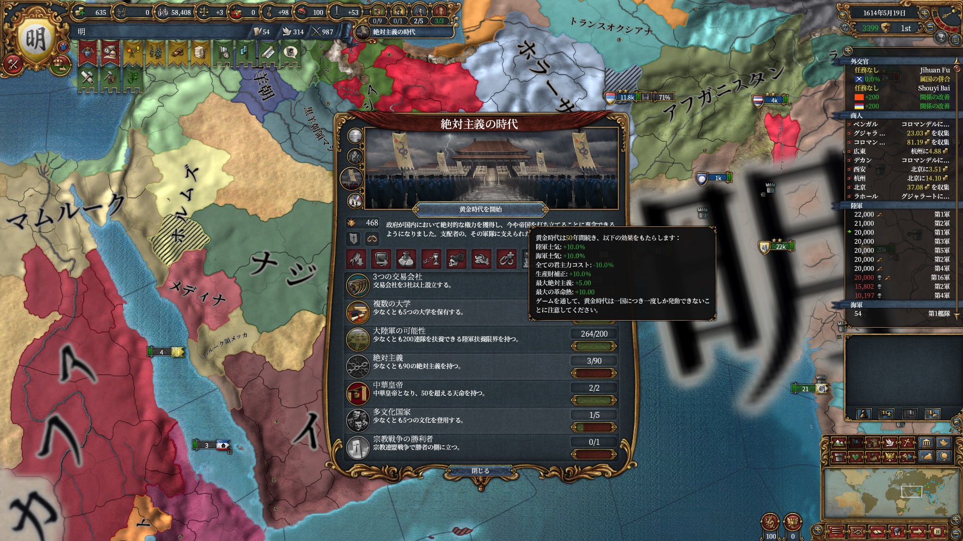 中華帝国は能力主義が入る代わり正統性がなく絶対主義が他の国と比べて10低いので、黄金時代発動で無理矢理ブーストし国難の終了時の閾値65(85)を満たしやすくします。
