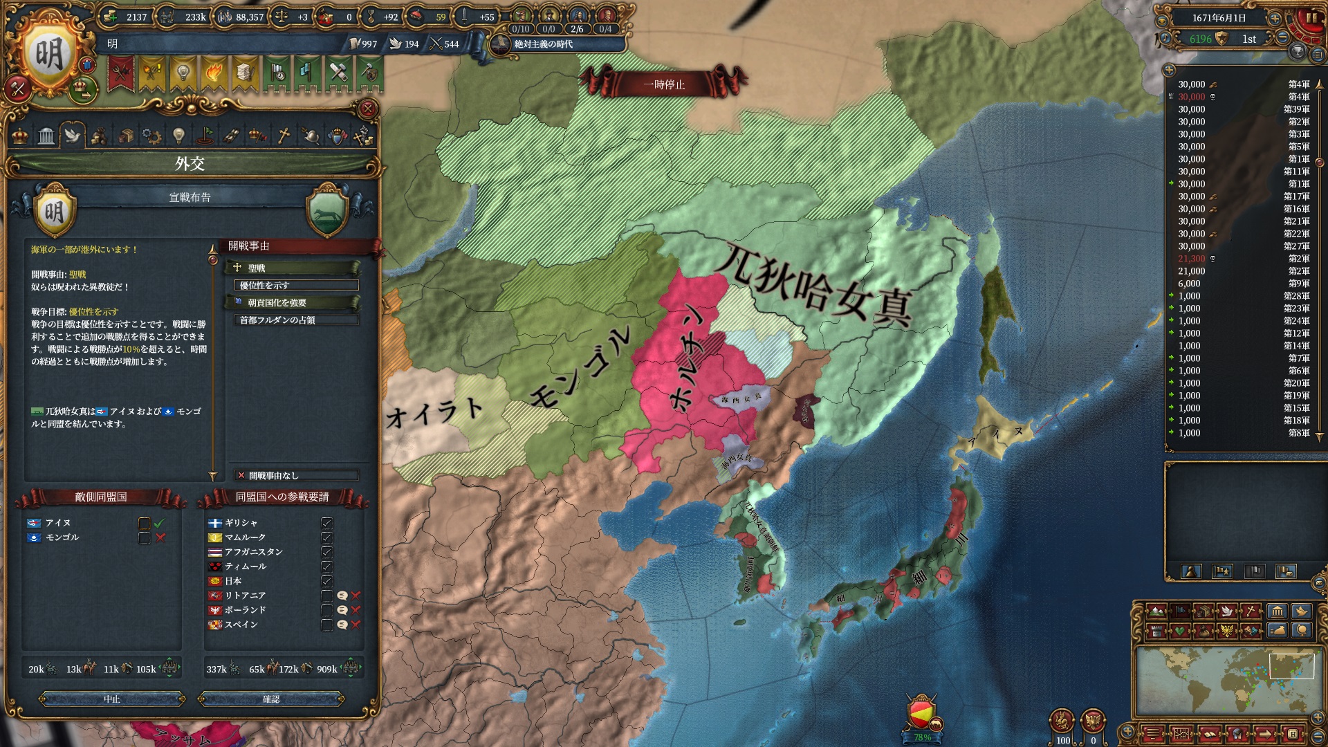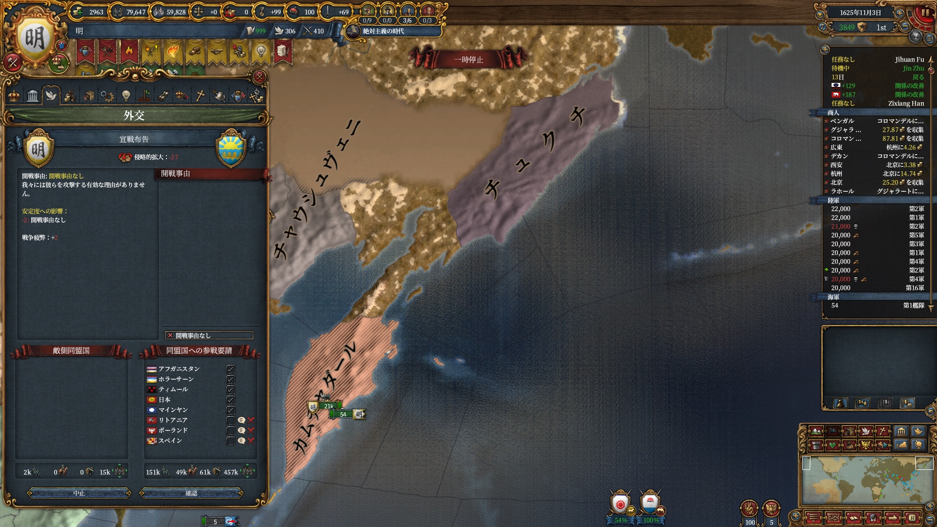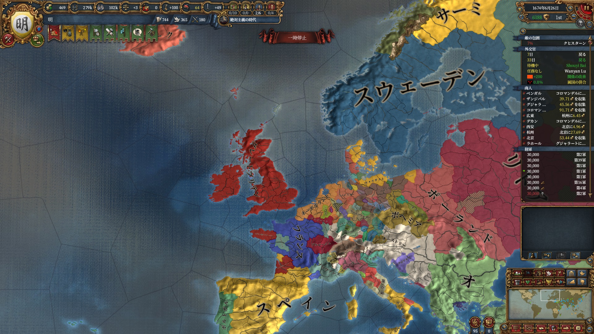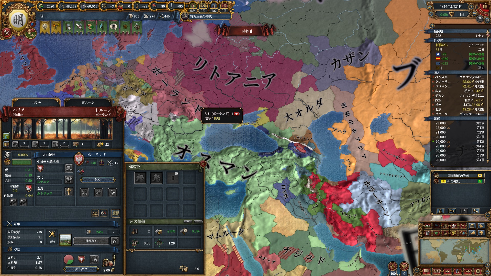 プレイヤーだけでなくAIも同盟国剥がしに向かう事が多いです。南側は明とかなり遠いスペインに対し北は隣接しているポーランド・リトアニア。彼らの領土が吹き飛んでいる間に南を掘り進めましょう。