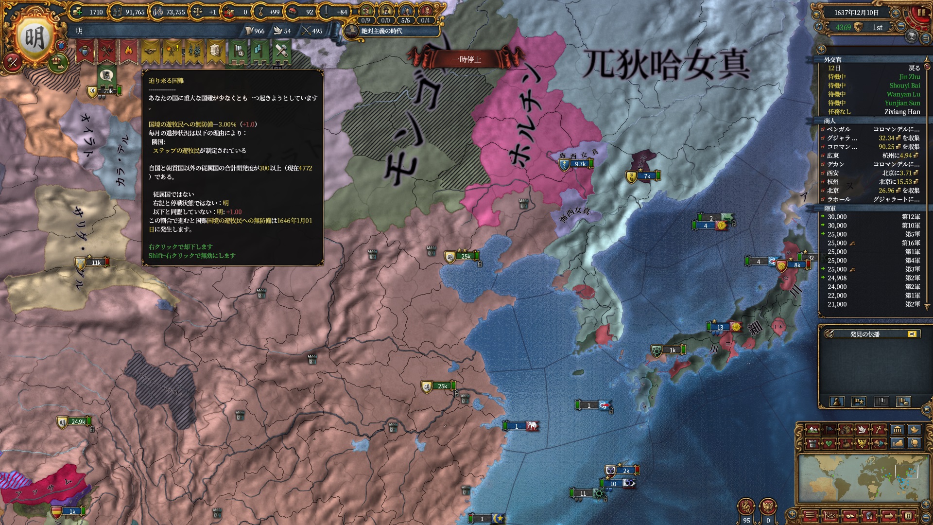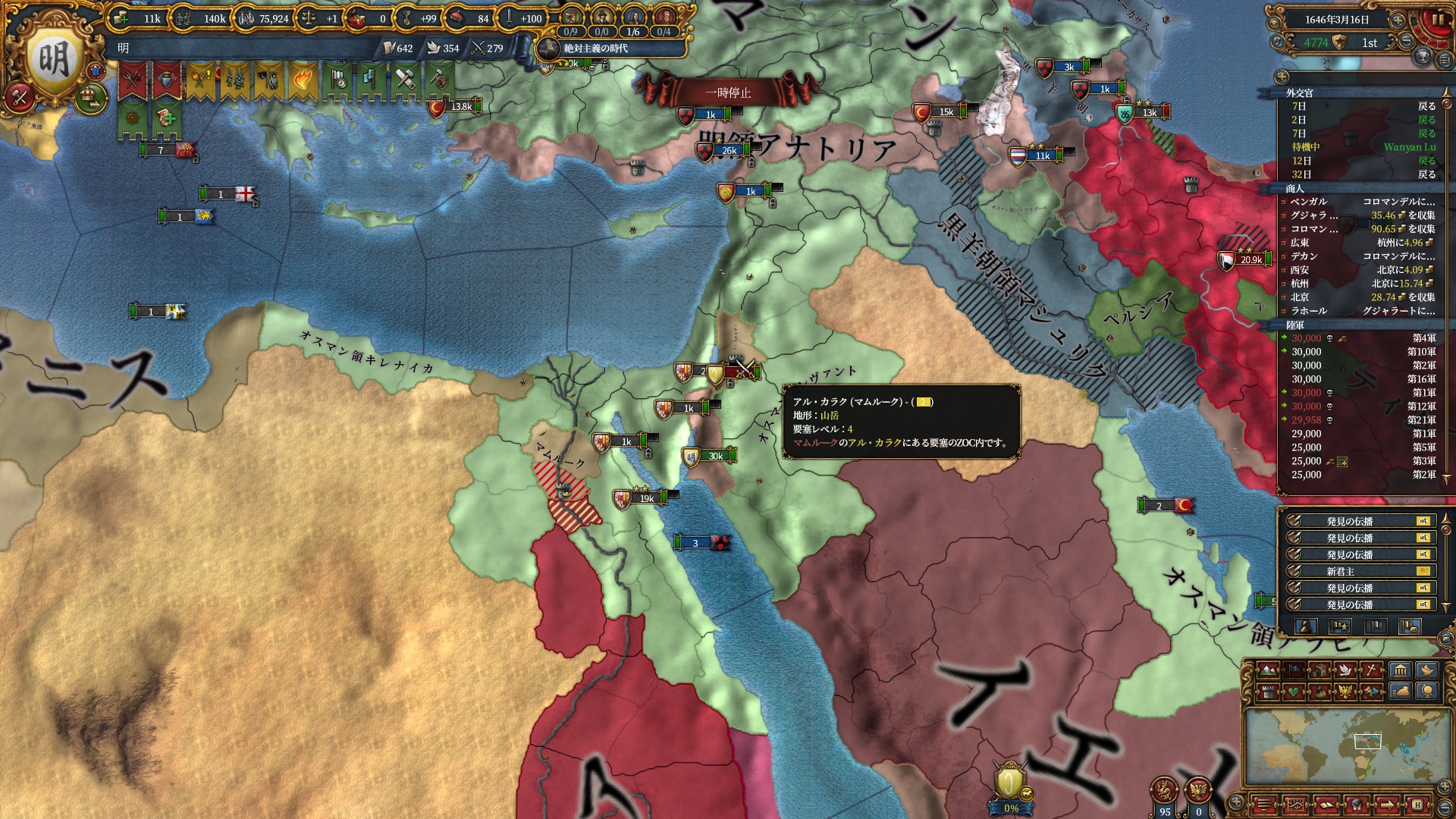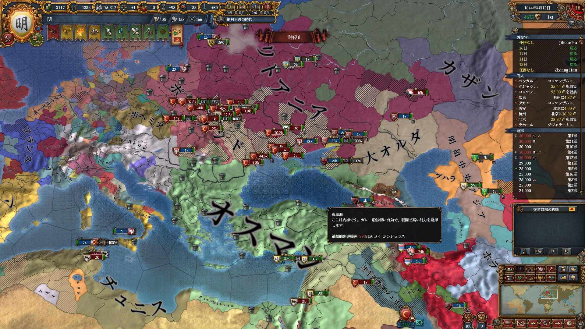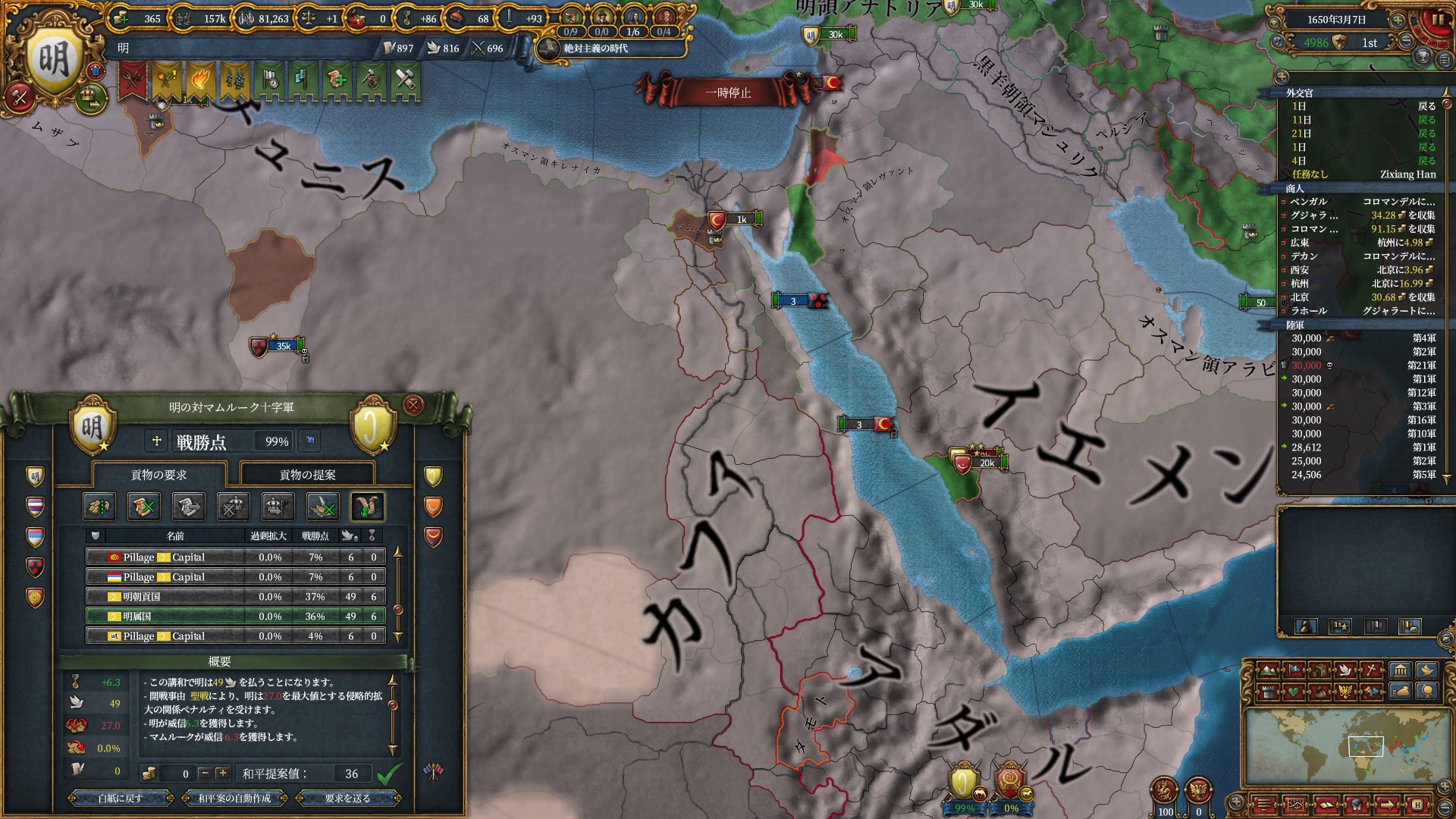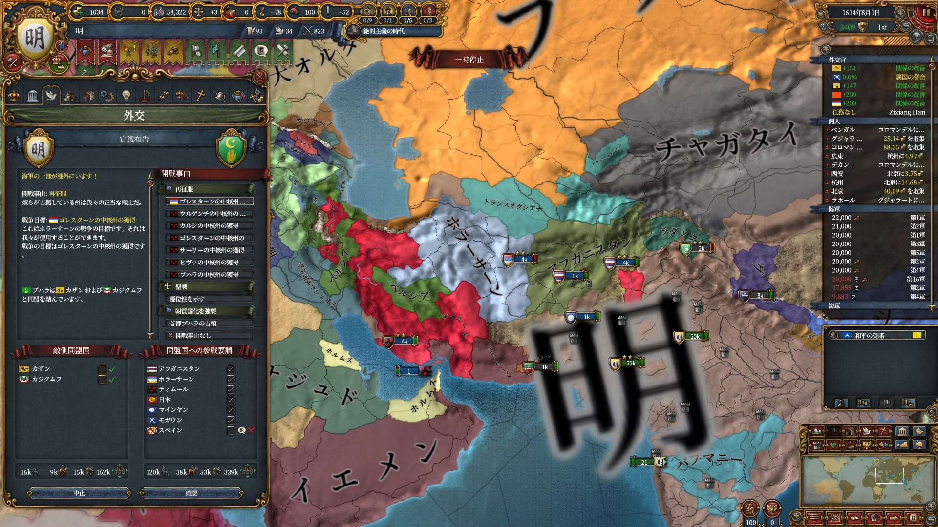 プレイヤーだけでなくAIも同盟国剥がしに向かう事が多いです。南側は明とかなり遠いスペインに対し北は隣接しているポーランド・リトアニア。彼らの領土が吹き飛んでいる間に南を掘り進めましょう。