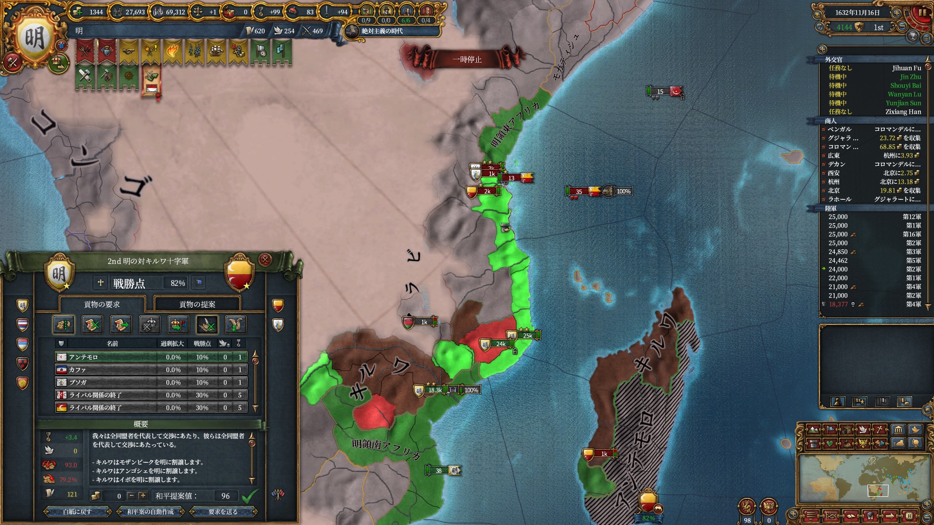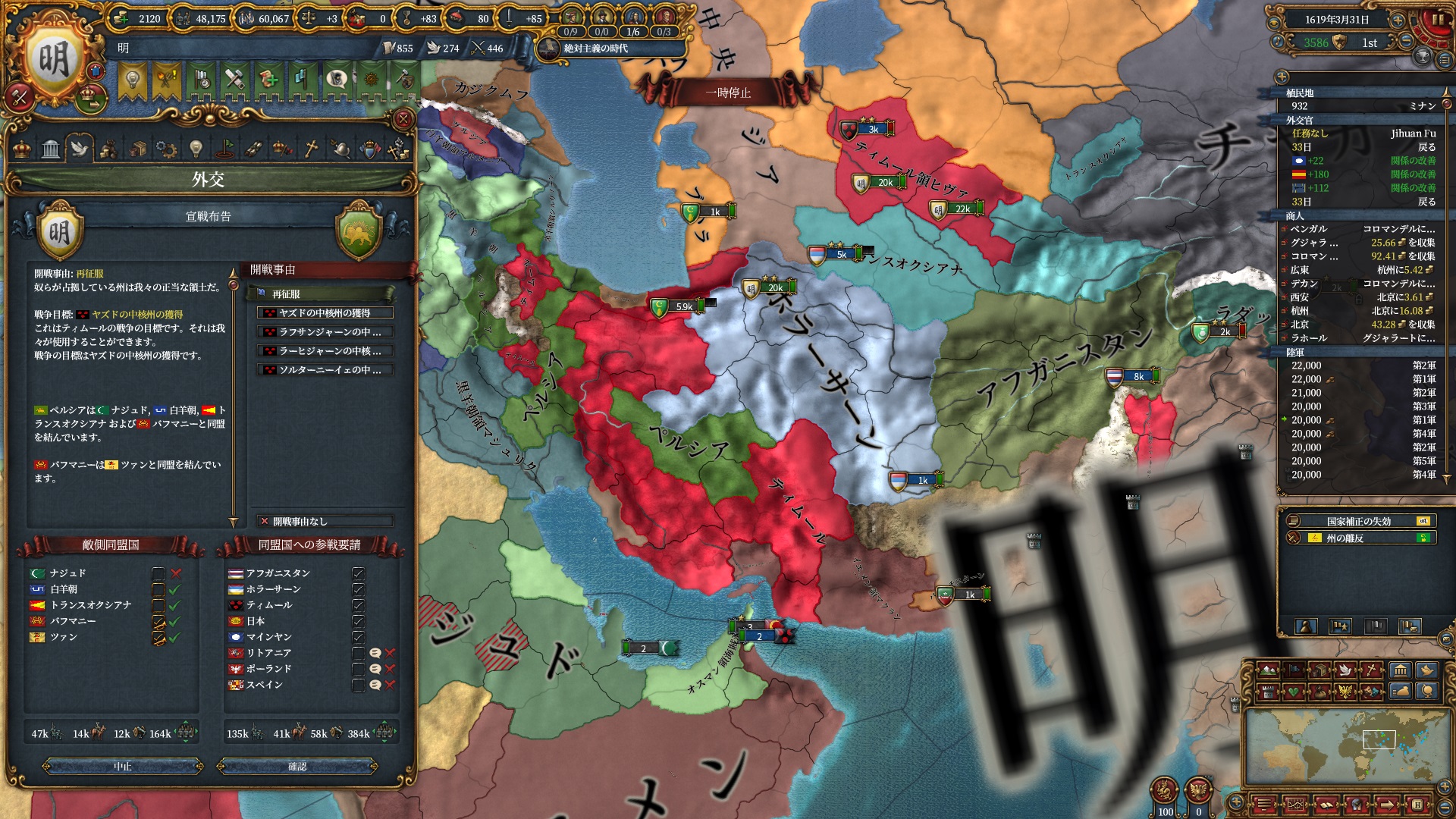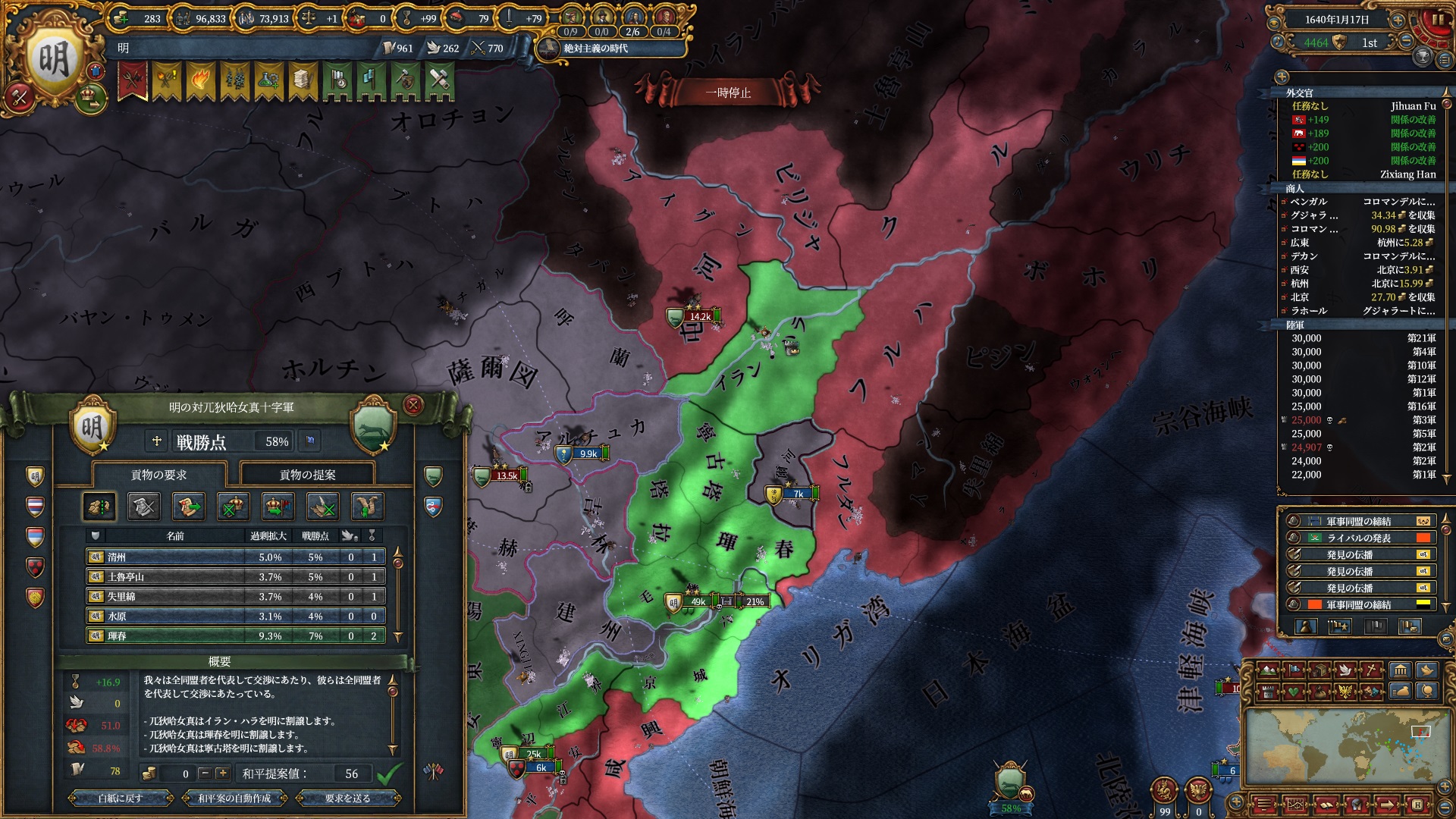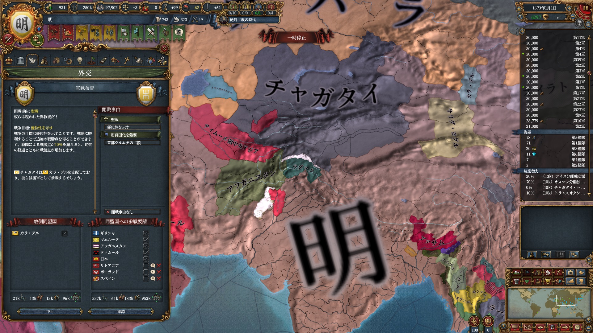 プレイヤーだけでなくAIも同盟国剥がしに向かう事が多いです。南側は明とかなり遠いスペインに対し北は隣接しているポーランド・リトアニア。彼らの領土が吹き飛んでいる間に南を掘り進めましょう。