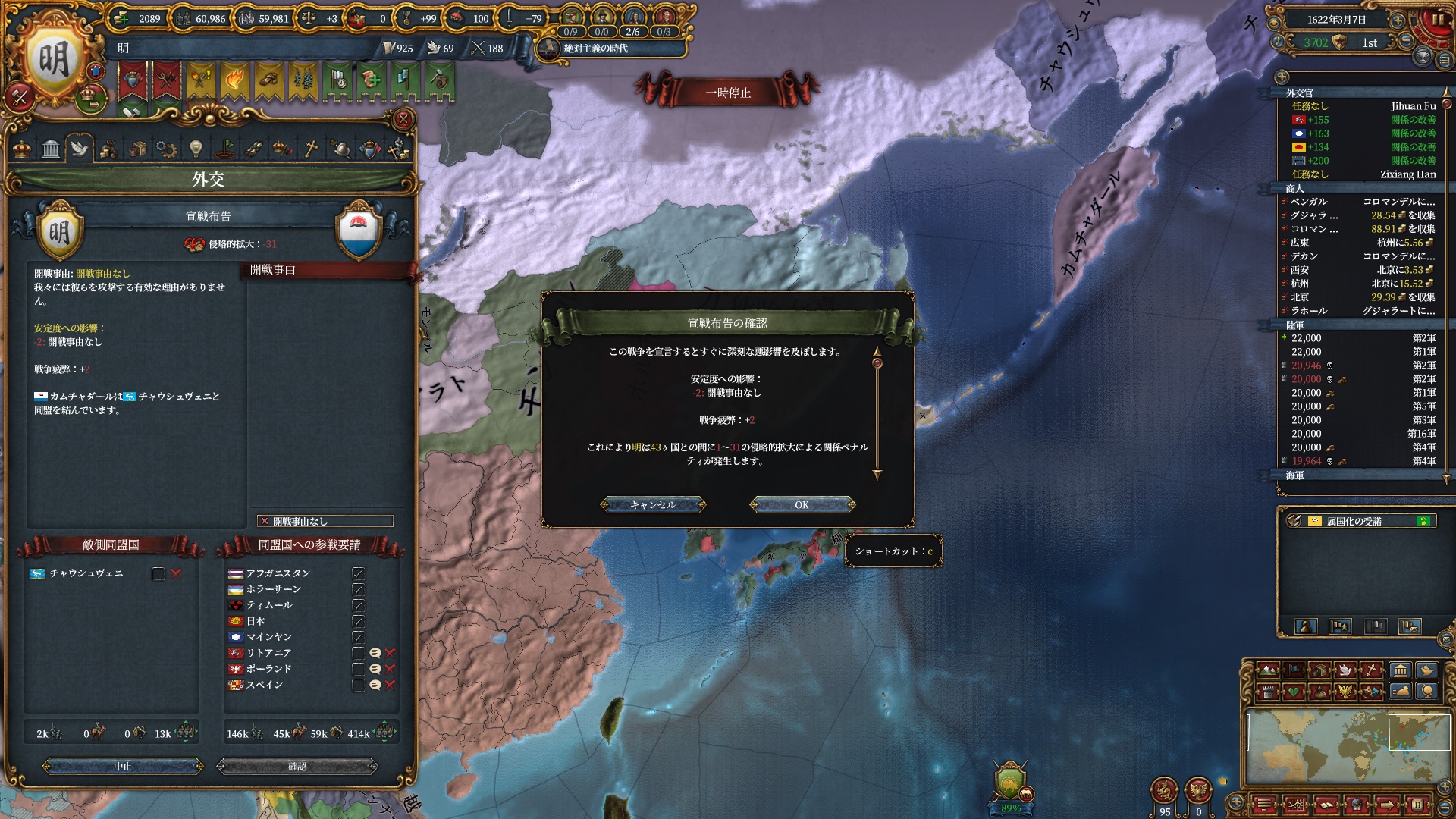 安定度・戦争疲弊ペナルティを貰いにカムチャダールNOCBをしかけます。