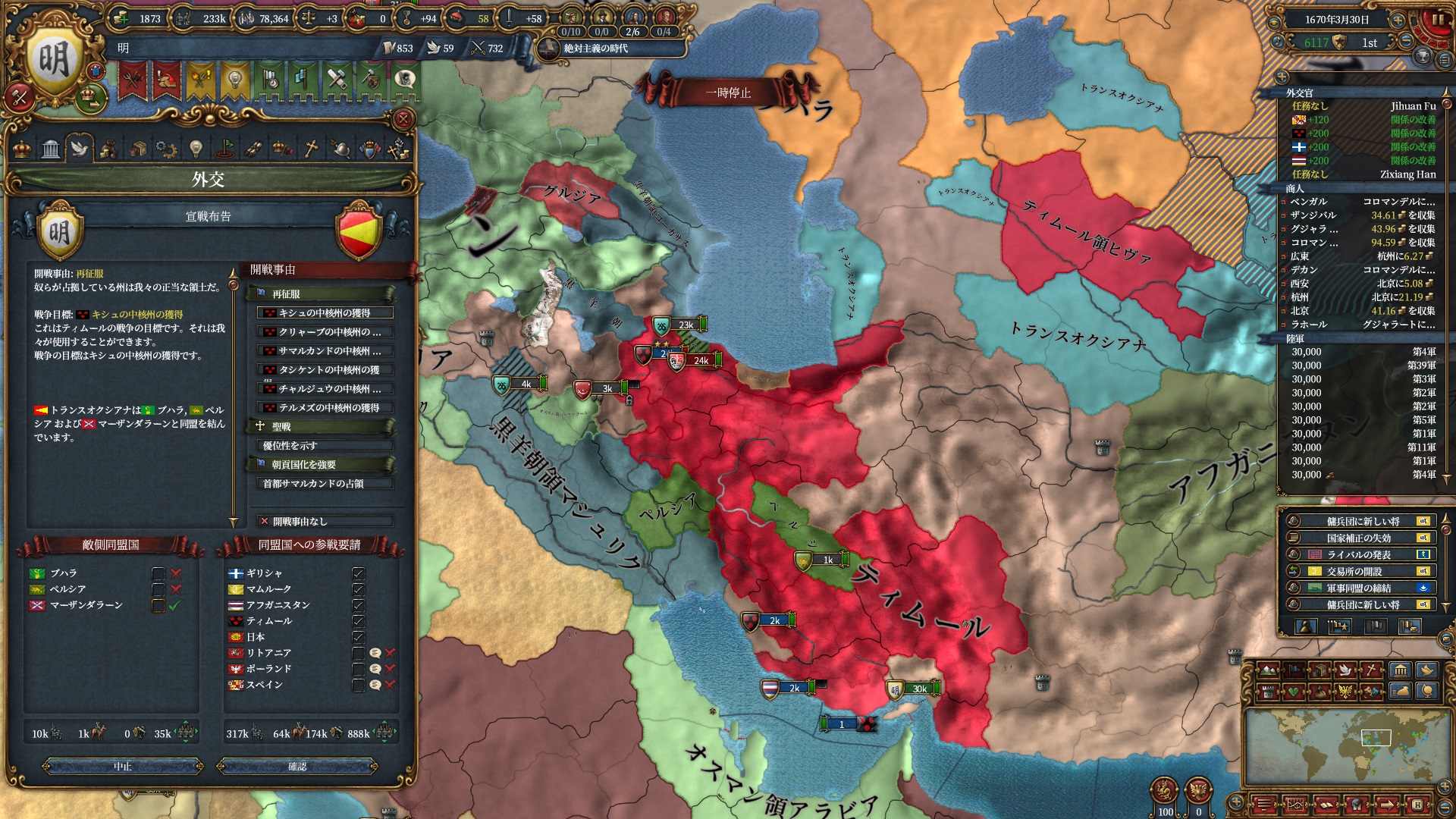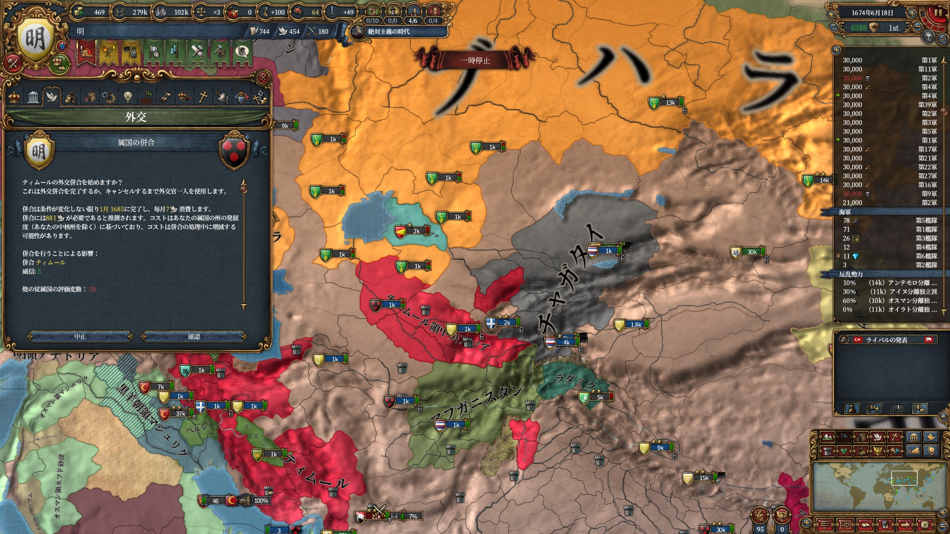 コアを取り終わったのもあり、長らく共に戦ったティムールの併合を開始します。