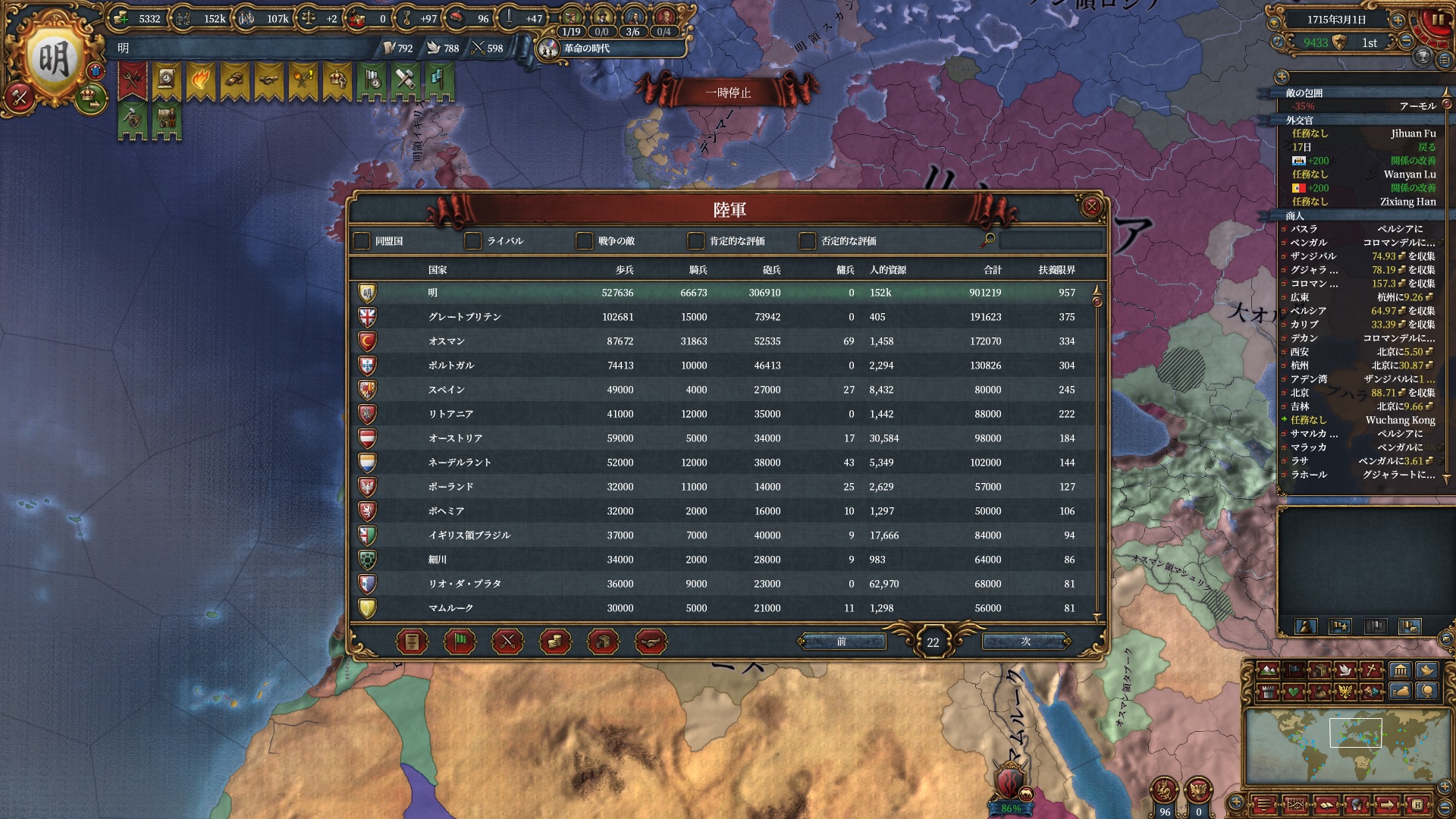 同盟国達はTrustが100に張り付いているのもあって為暫くは同盟のままでいてくれますが、そのうちAEのマイナスでopinionが+を維持できなくなり同盟強勢破棄となる為いけるところまで使い倒します。