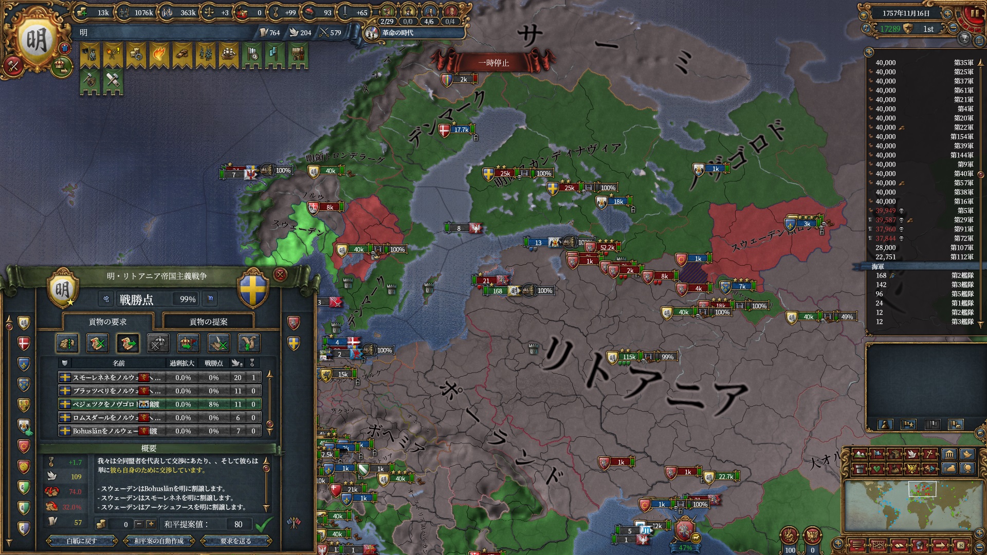 全州取得に必要な戦勝点は100を超えていますが帝国主義CBで75%の領地割譲と組み合わせれば(AEは無視するとして)属国に出来そうです。