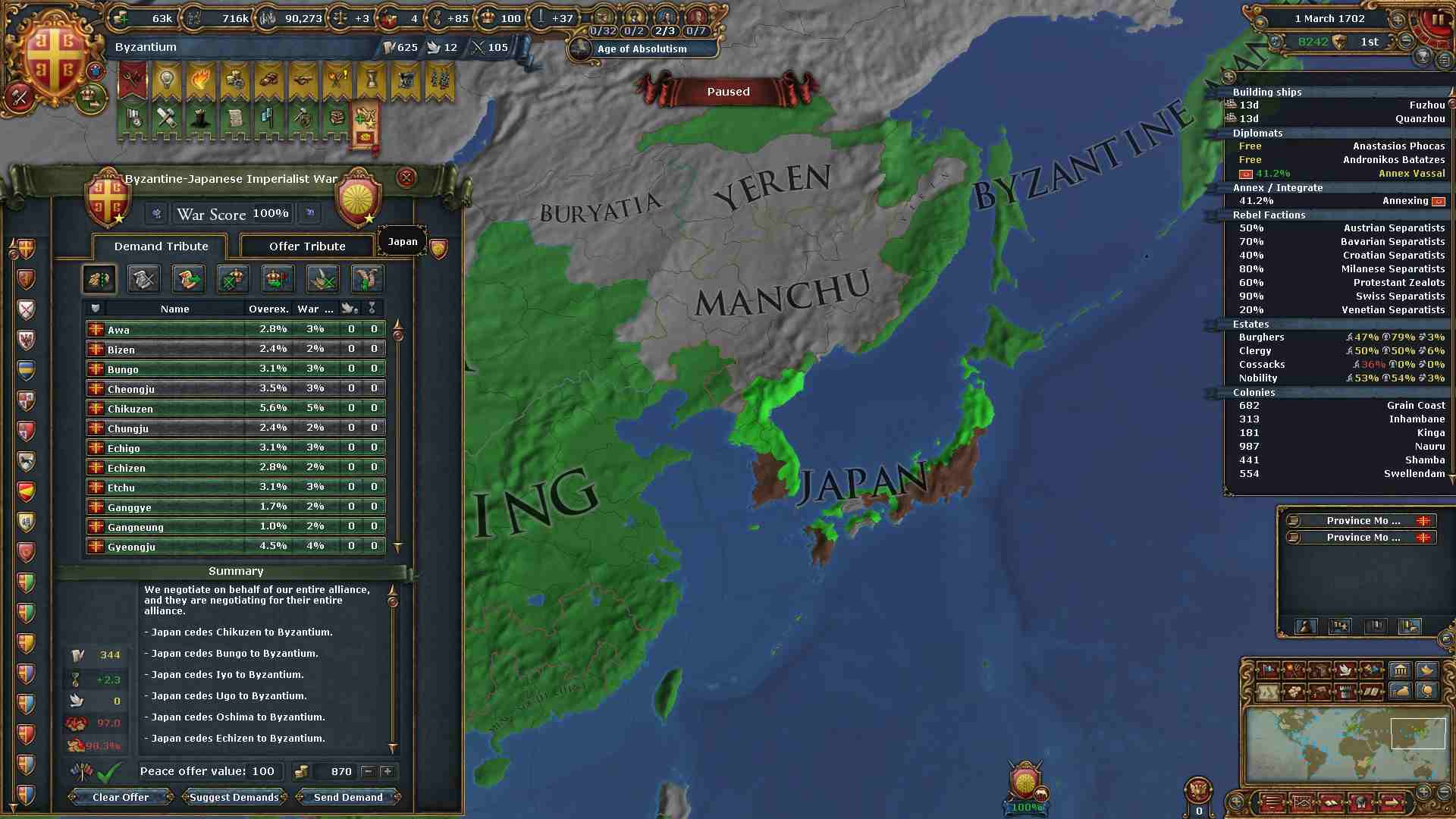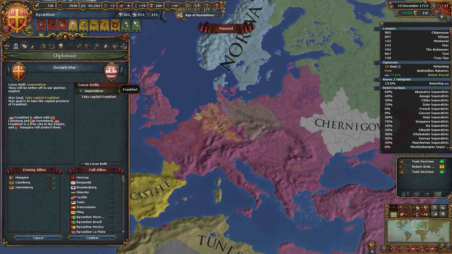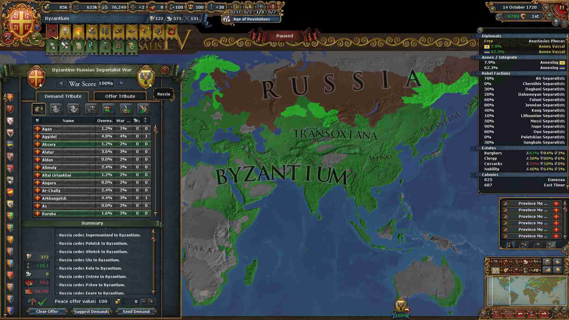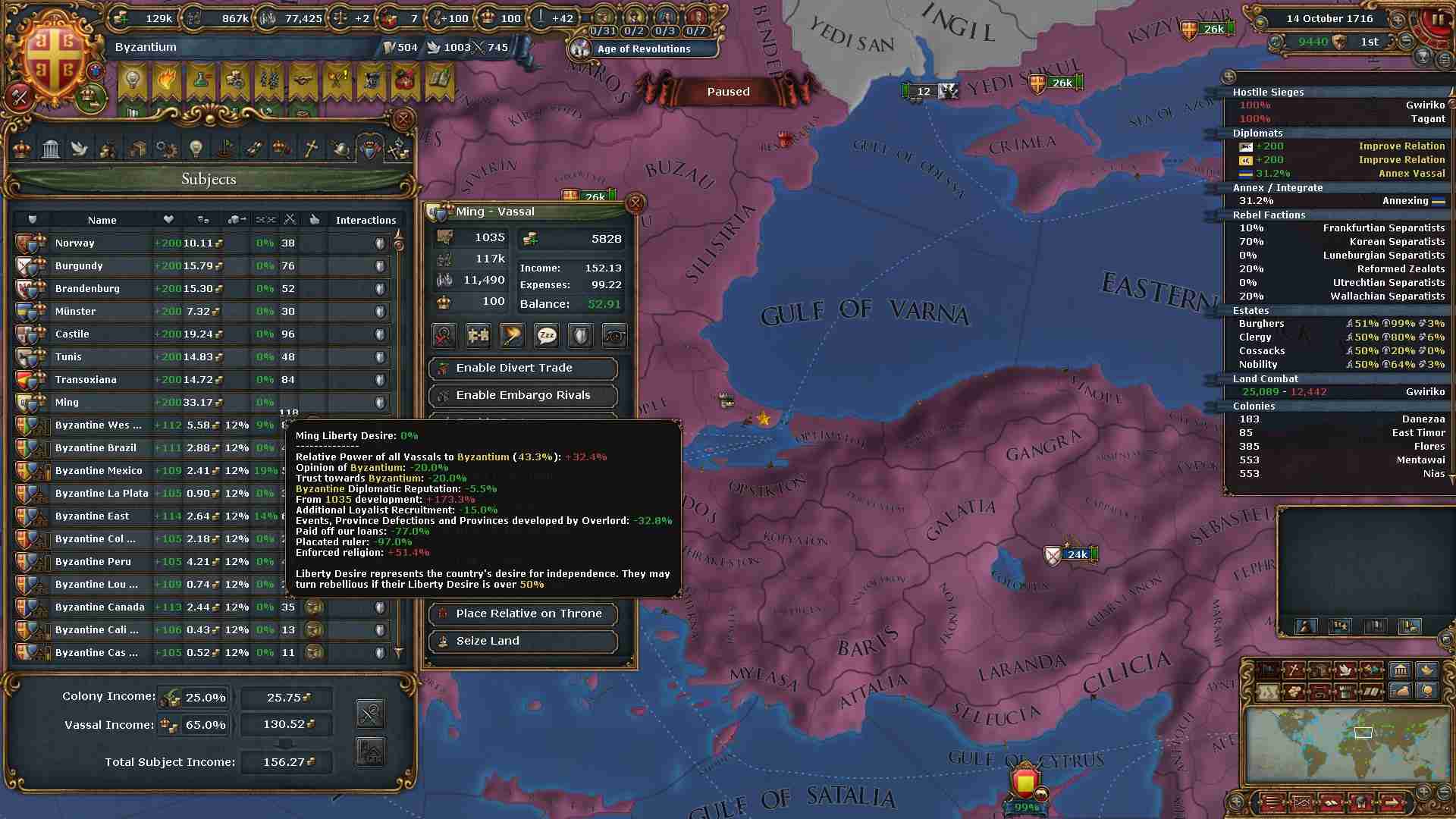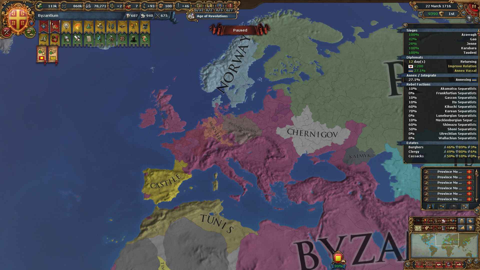 急激な拡大な為、属国に大量の領土を渡しているので反乱が頻発しています。