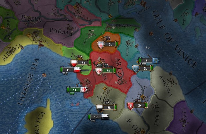 足かせになるのは他国の同盟関係とAEだろう.たまに周辺国がFranceやAragonと同盟していて身動きが取れなくなるのだが,今回は大国がイタリアにあまり絡んでこなかった.